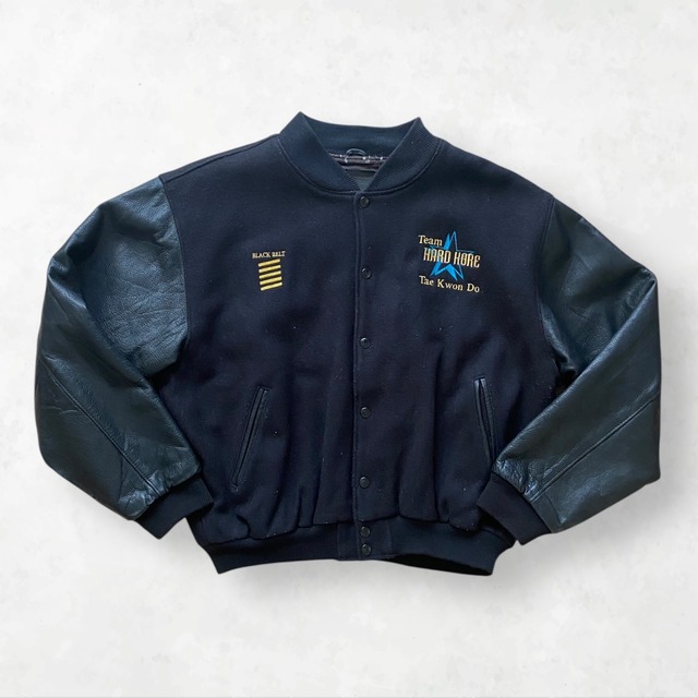>> Vibe Check 「目利きが惚れ込んだオールブラック。BLACK BELTの刺繍が語る、本物の貫禄。」 ゴールデンベア社製のヴァーシティジャケット。胸元の"BLACK BELT"や背面の"Tae Kwon Do"刺繍が、単なる古着を超えたストーリーを感じさせます。正直、この手のヴァーシティは数あれど、これだけストイックなオールブラックで攻めた個体は珍しい。オールブラックの重厚な佇まいは、モードにもストリートにも、着る人の個性を強く引き立てる一着です。 >> Item Details Brand: Golden Bear Origin: Made in USA Material: Wool / Leather Point: ヴァーシティジャケットの代名詞とも言えるゴールデンベア製。アメリカ製らしい質実剛健な作りながら、袖のレザーは非常に柔らかく、着始めから身体に馴染みます。今のストリートシーンに最適な、タフさと快適さを兼ね備えた一着です。 >> Size & Fit (平置き実寸) 「短丈×超広身幅のバギーなボックスシルエット。 強力な裾リブが生み出す絶妙な"溜まり"と丸みのあるラインが、今の気分に完璧にフィットします。」 着丈: 61 cm 身幅: 69 cm 肩幅: 59 cm 袖丈: 63 cm Fitting: 165cm前後(裾を絞った丸みのあるオーバーサイズ)〜 180cm(短丈を活かした無骨なクラシックスタイル) !! AI Styling Preview 掲載されている着画はAIによるスタイリングイメージです。「この服が一番カッコよく見える瞬間」を表現しています。 正確な色味やディテールは、実物写真(無加工)を必ずご確認ください。 【サイズ感の個別相談を承ります】 「自分の体型に合うか不安」「AI着画(Visualizer)とのギャップを確認したい」という方は、**InstagramのDM( @whatever_usedclothes )**までお気軽にご連絡ください。 以下の3点を送っていただければ、店主が一点一点、実寸と照らし合わせて回答します。 ・検討中のアイテム名 ・身長 / 体重 ・お悩み(例:筋トレで肩幅が広い、腕が長い、オーバーサイズで着たい等) >> Condition Rank: B Memo: 普通に使い込まれた感じはありますが、変な汚れやダメージはなし。袖のレザーもちゃんとケアされてて、むしろいい具合にしなやか。まだまだガシガシ着てもらえるコンディションです。