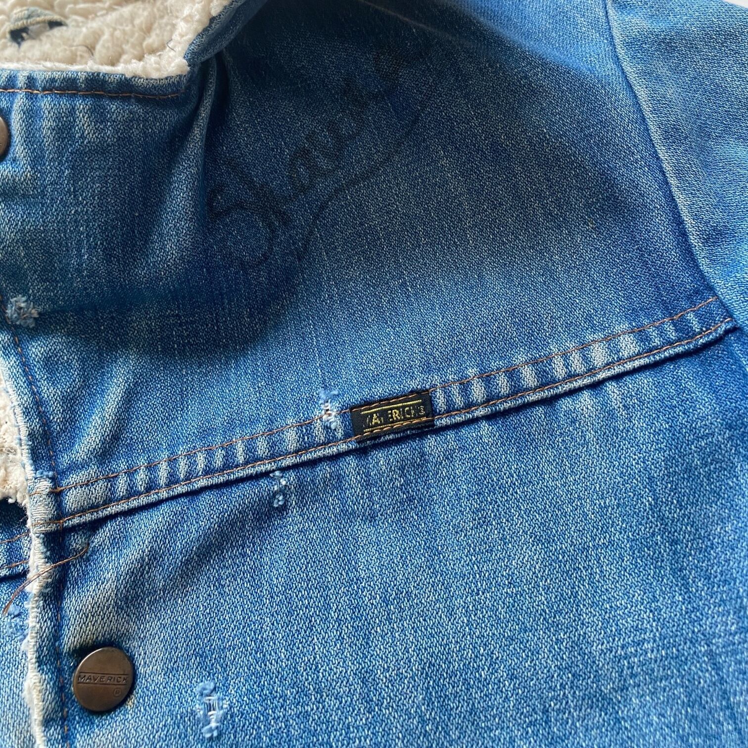 70年代マーベリックのランチコート。袖のダメージ、ボディに点在する穴、そして左肩に無造作に記されたサイン。そのすべてが、前のオーナーがこの一着と過ごしたリアルな時間を物語っています。正直、これだけダメージがあるアイテムを仕入れるか迷いましたが、実物を触った瞬間に「これは絶対に誰かに愛されるべき一着だ」と確信しました。計算では作れない「本物」の経年変化を楽しめる、まさに一点モノのアーカイブです。