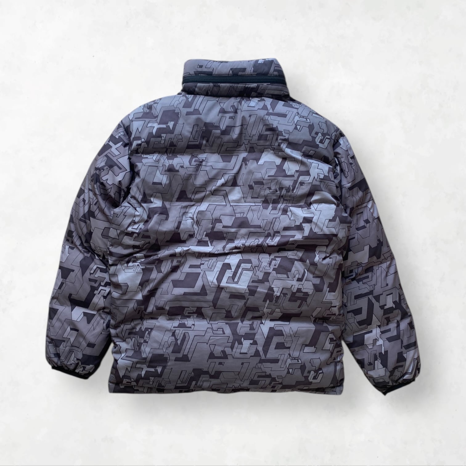00年代のStussyアーカイブの中でも異彩を放つ、総柄のパファージャケット。無機質なグレーのグラデーションと、計算されたボリューム感が、今のテック系スタイルやストリートに完璧なエッジを加えます。当時からちょっと変わり種だったこのパターン、むしろ今の方がハマるんじゃないかと思って仕入れました。