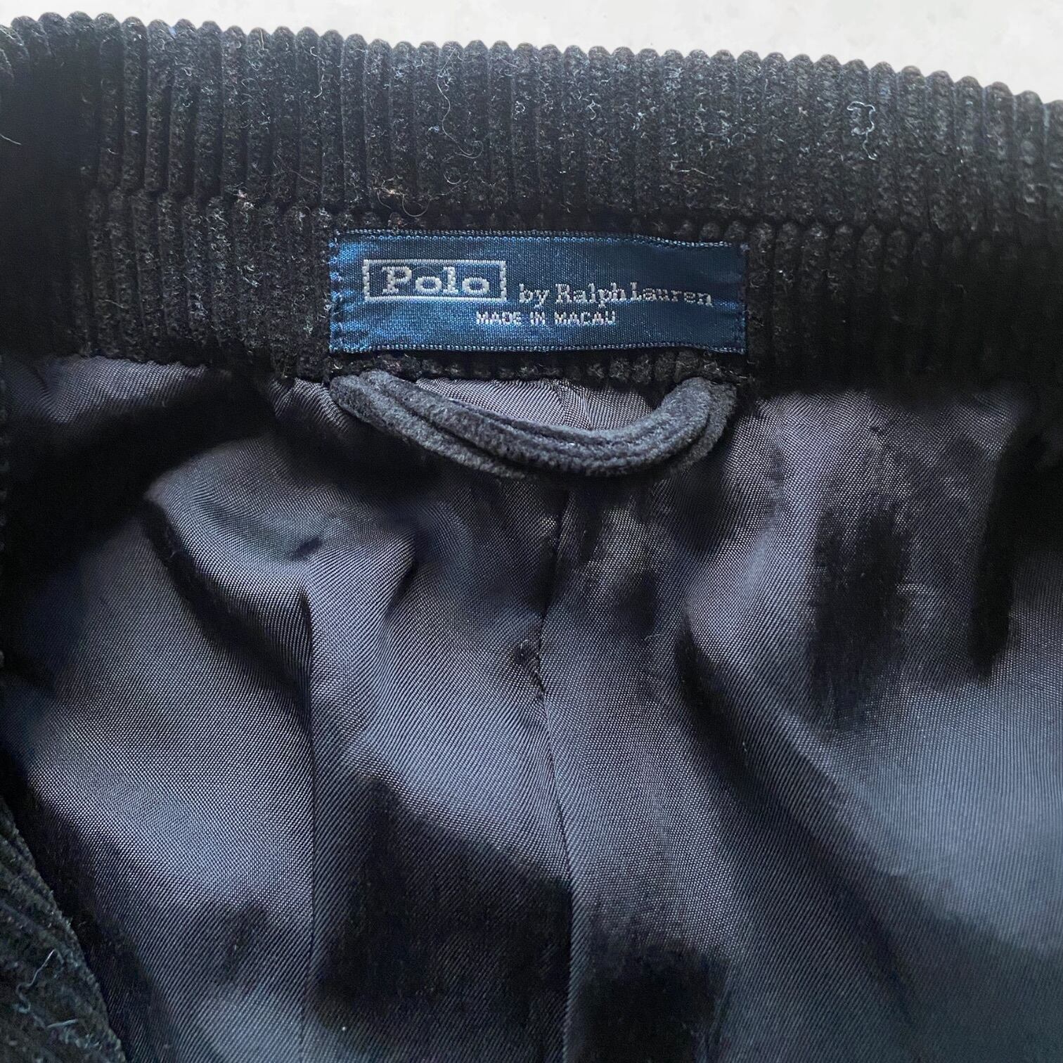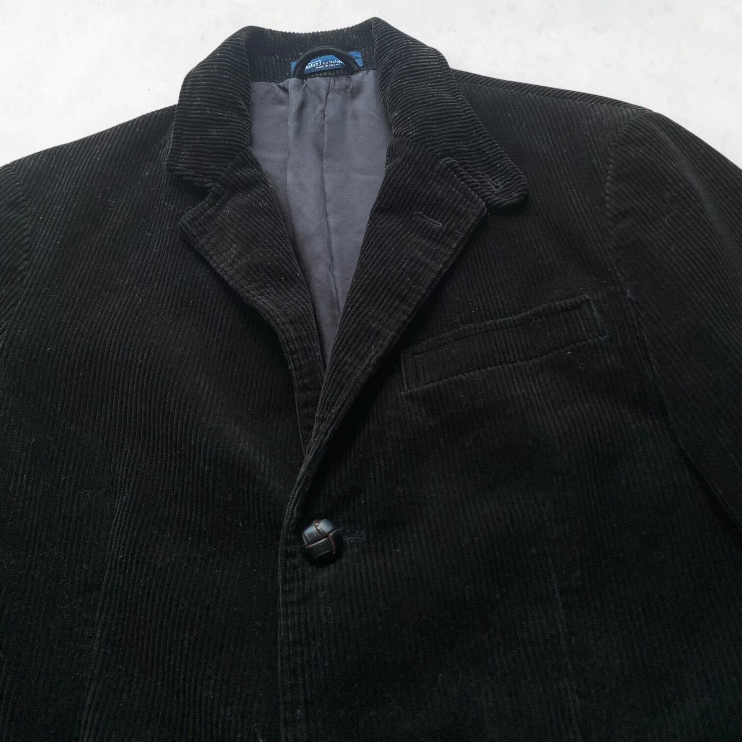 90年代ラルフローレンのコーデュロイブレザー。 都会的なブラックの太畝(ふとうね)生地が、クラシックな仕立てと相まって、圧倒的な気品と無骨さを同時に引き出します。 この質感の良さとシルエットの美しさに一目惚れして仕入れた一着です。時代に流されない、自分だけのスタンダードを求める方へ。
