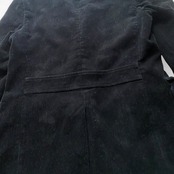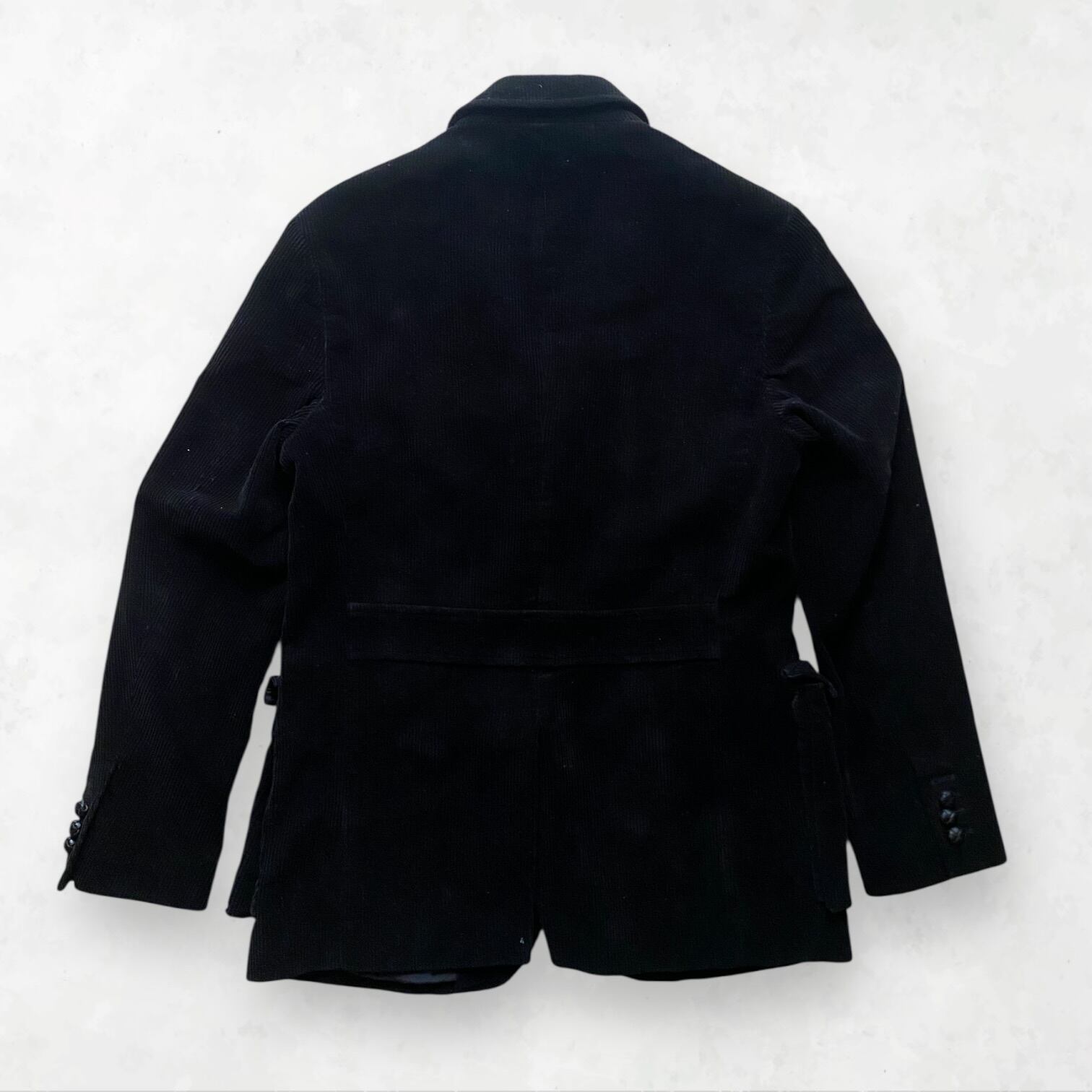 Point: ブラックの太畝コーデュロイに、レザーのくるみボタンが美しく映える一着。 ウエストラインのバックスタイルにはベルトディテールが施され、シルエットを崩さずスマートな着用を可能にします。 先日提案したDUCA VISCONTIのブラックショーツとのセットアップは、今季最も推奨したいスタイリングの一つです。
