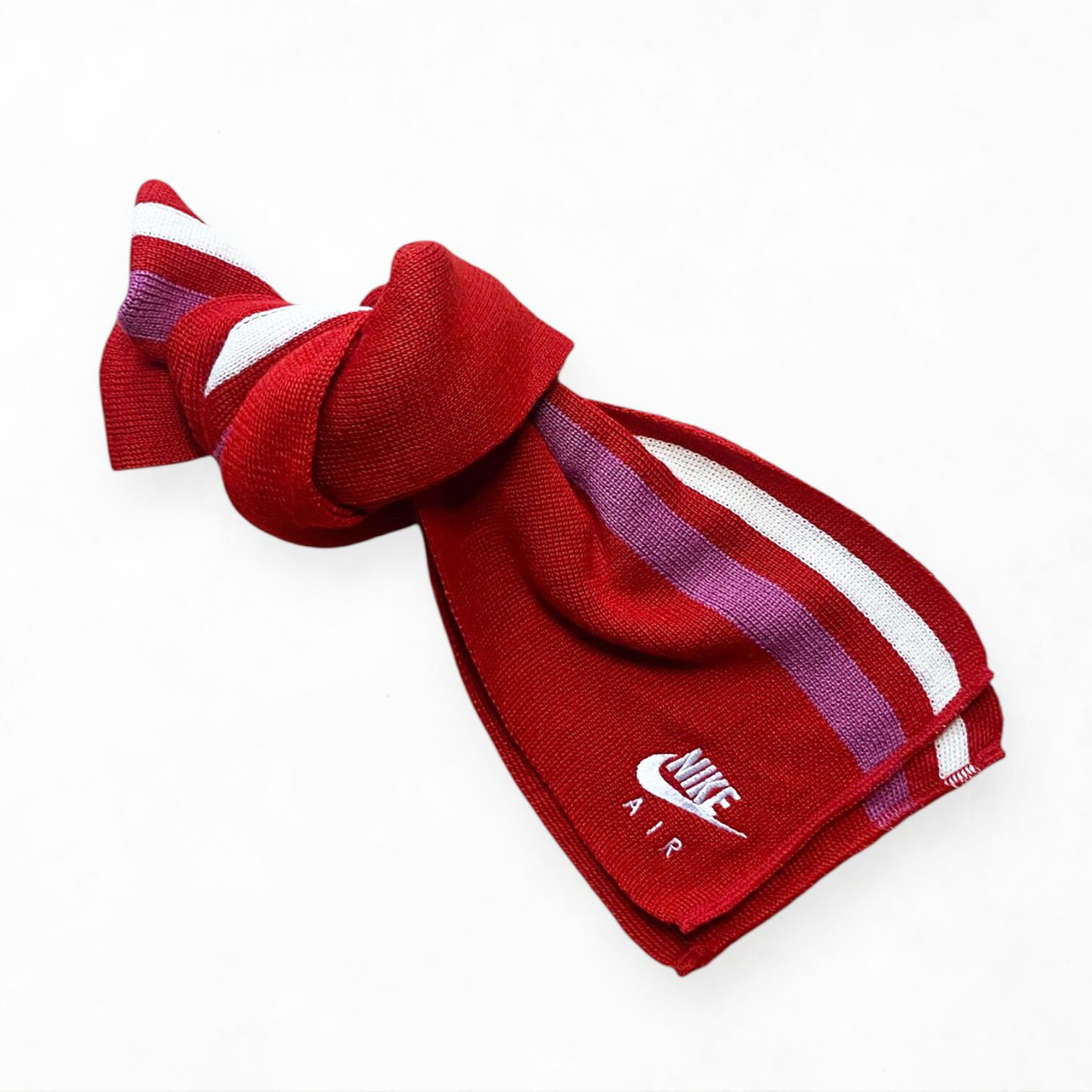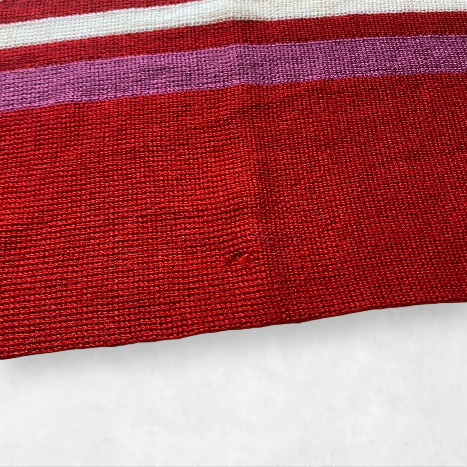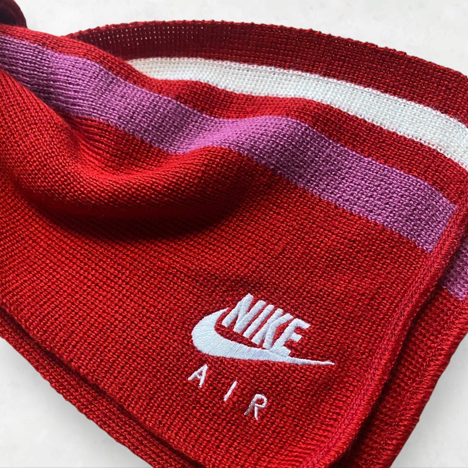 ナイキのスポーツVibeを凝縮したニットマフラー。鮮やかなレッドをベースに、パープルとホワイトのラインが絶妙なレトロ・スポーティ感を演出します。古着屋を巡っていても、これほど色のバランスが絶妙なナイキアイテムってなかなか出会えないんです。暗くなりがちな冬のコーディネートに、確かな熱量とエッジを加えてくれる一本です。