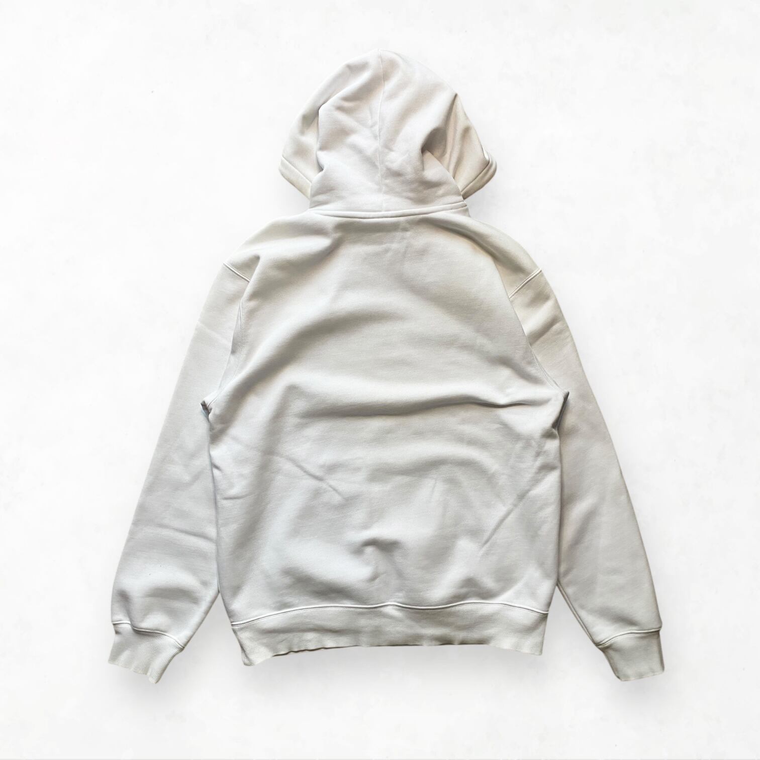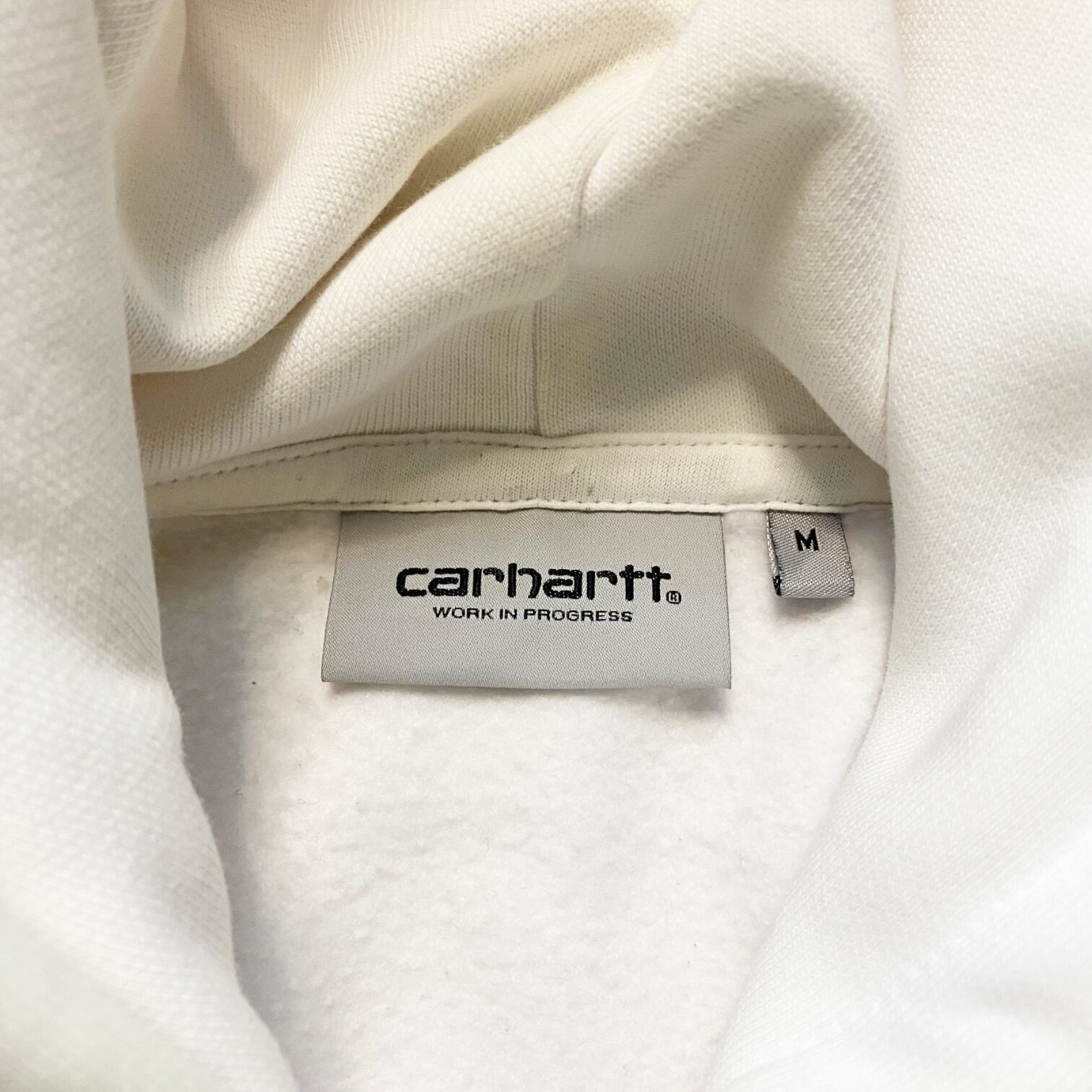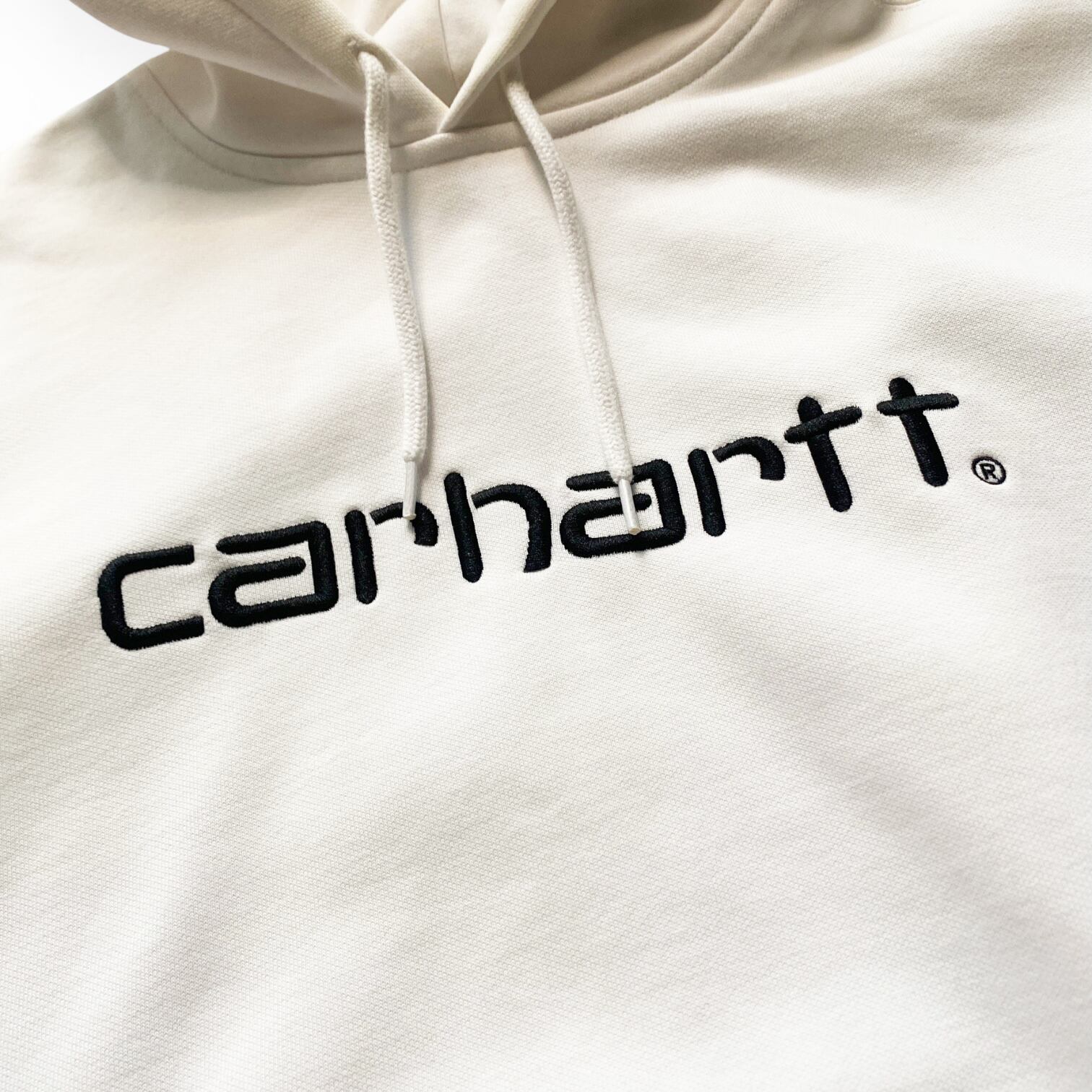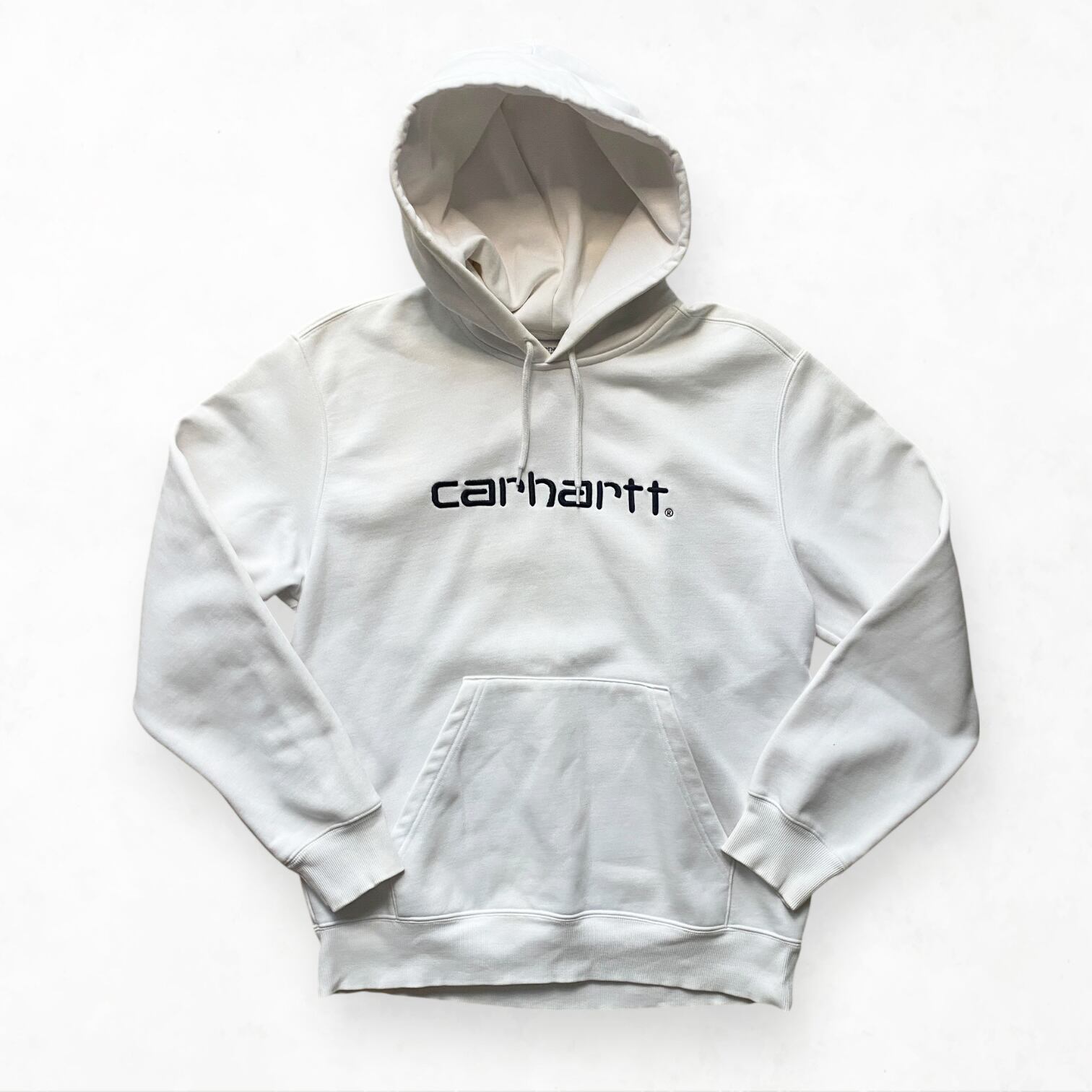 00年代カーハートのプルオーバーフーディ。清潔感あふれるホワイトボディに、フロントの黒いブランドネーム刺繍が力強く映えます。個人的にカーハートのフーディは数多く見てきましたが、この白×黒刺繍の組み合わせは特に汎用性が高く、即決で仕入れました。ワークウェア由来のタフな作りと、現代の街並みに馴染むクリーンなルックスを兼ね備えた、ワードローブの核となる一着です。