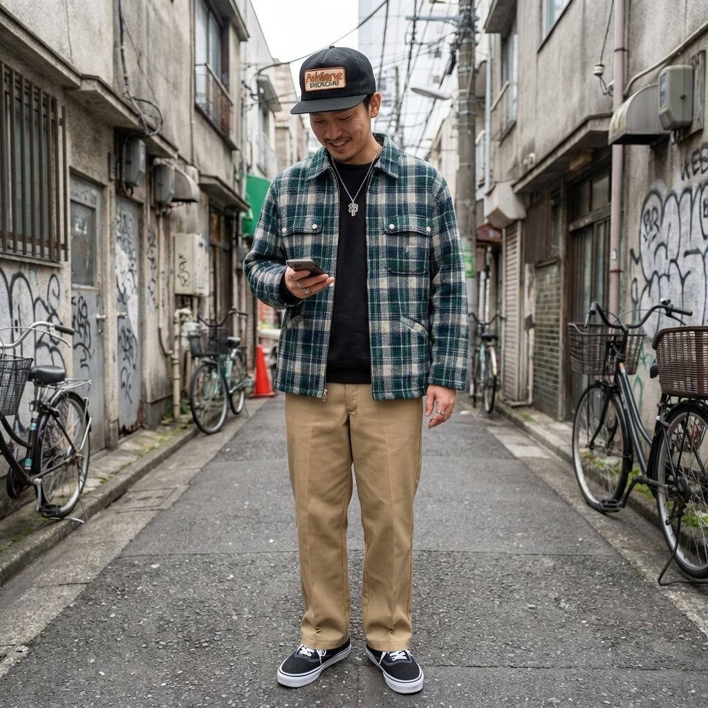 掲載されている着画はAIによるスタイリングイメージです。「この服が一番カッコよく見える瞬間」を表現しています。 正確な色味やディテールは、実物写真(無加工)を必ずご確認ください。