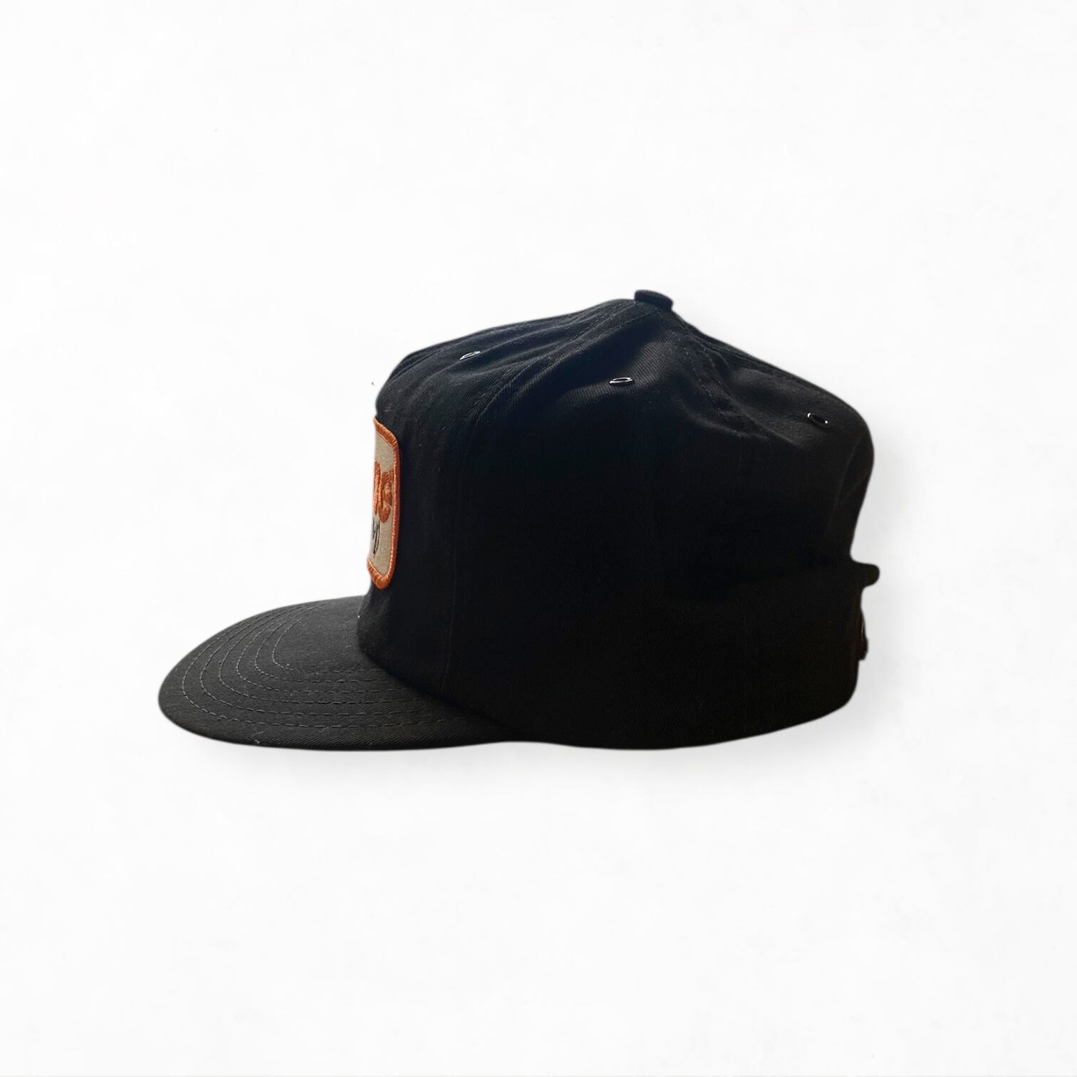 Point: 鮮やかなオレンジの縁取りが効いたパッチデザイン。アメリカ製ならではのタフなコットンキャンバス地は、被り込むほどに自分だけの形に馴染んでいきます。スタンダードなスナップバック仕様で、背面からのルックスも完璧です。