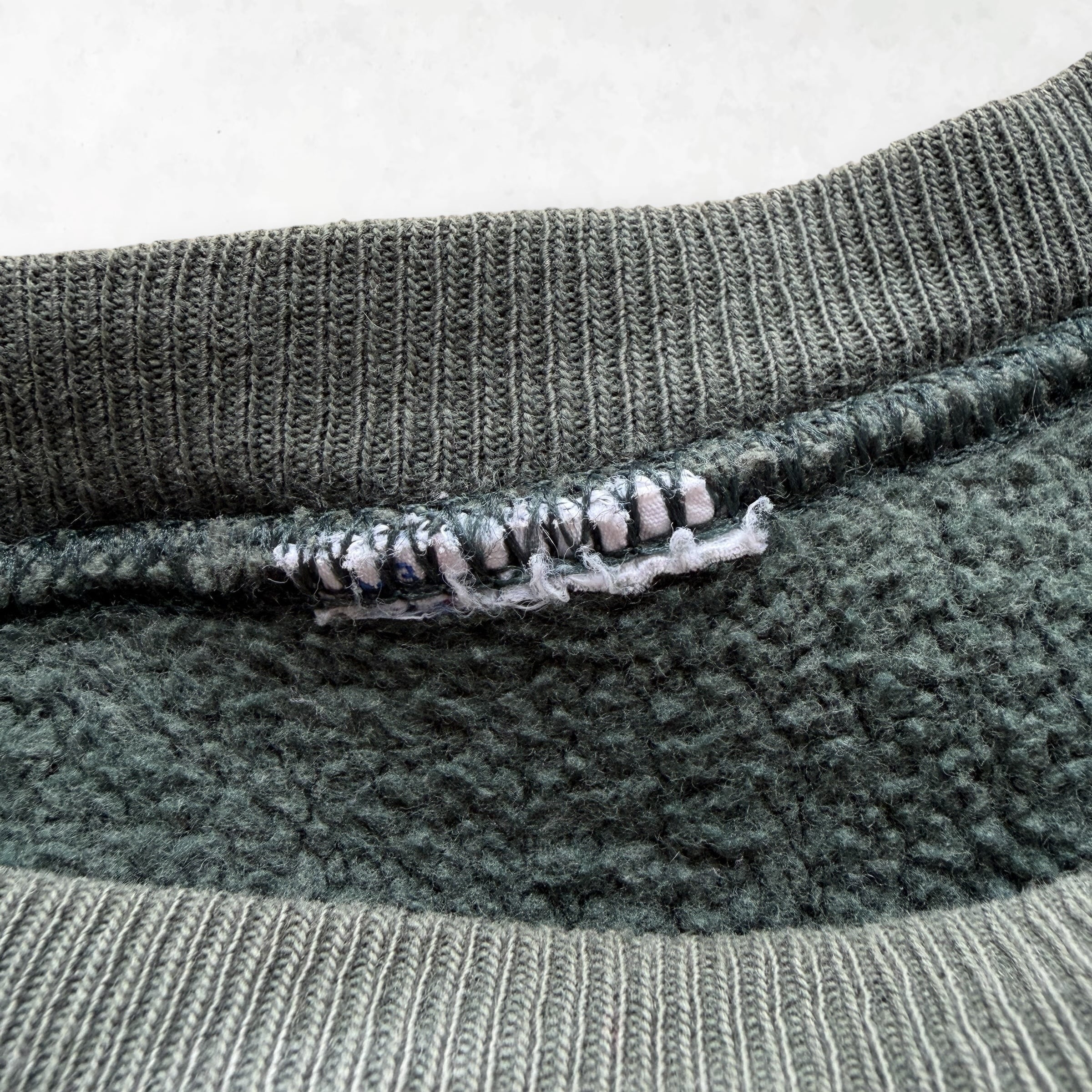 90年代チャンピオンのリバースウィーブ。長い年月を経て、深く、そして淡くフェードした独特のグリーンが唯一無二の存在感を放ちます。厚みのある生地に刻まれたひび割れプリントは、まさにヴィンテージ・スウェットの理想形。