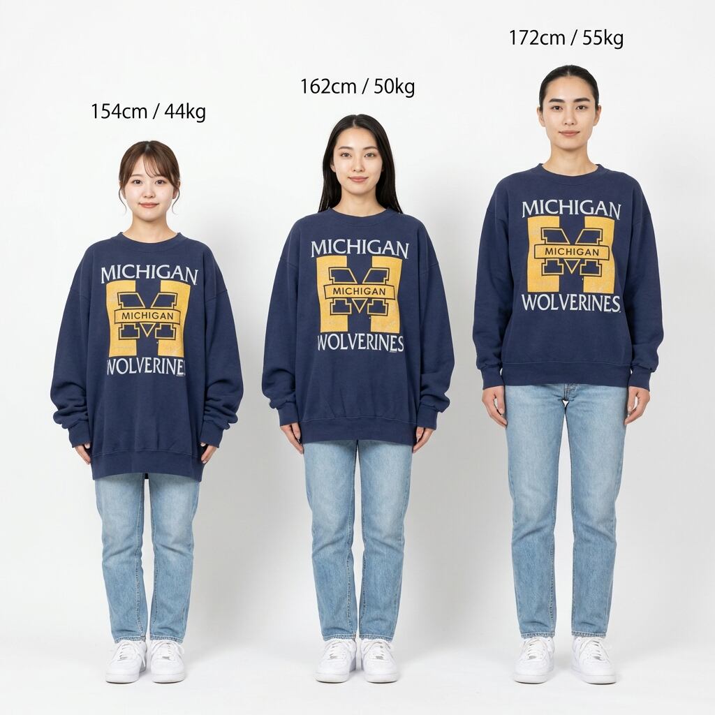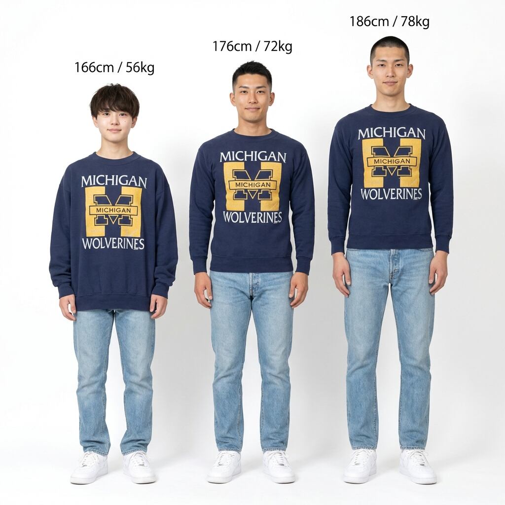 Point: コットン50%・ポリエステル50%の黄金比が生み出す、ふんわりと柔らかく肌に馴染むような着心地が最大の魅力。フロントには「MICHIGAN WOLVERINES」のビッグロゴが施され、ストリートからアメカジスタイルまで幅広く対応する汎用性の高いアイテムです。