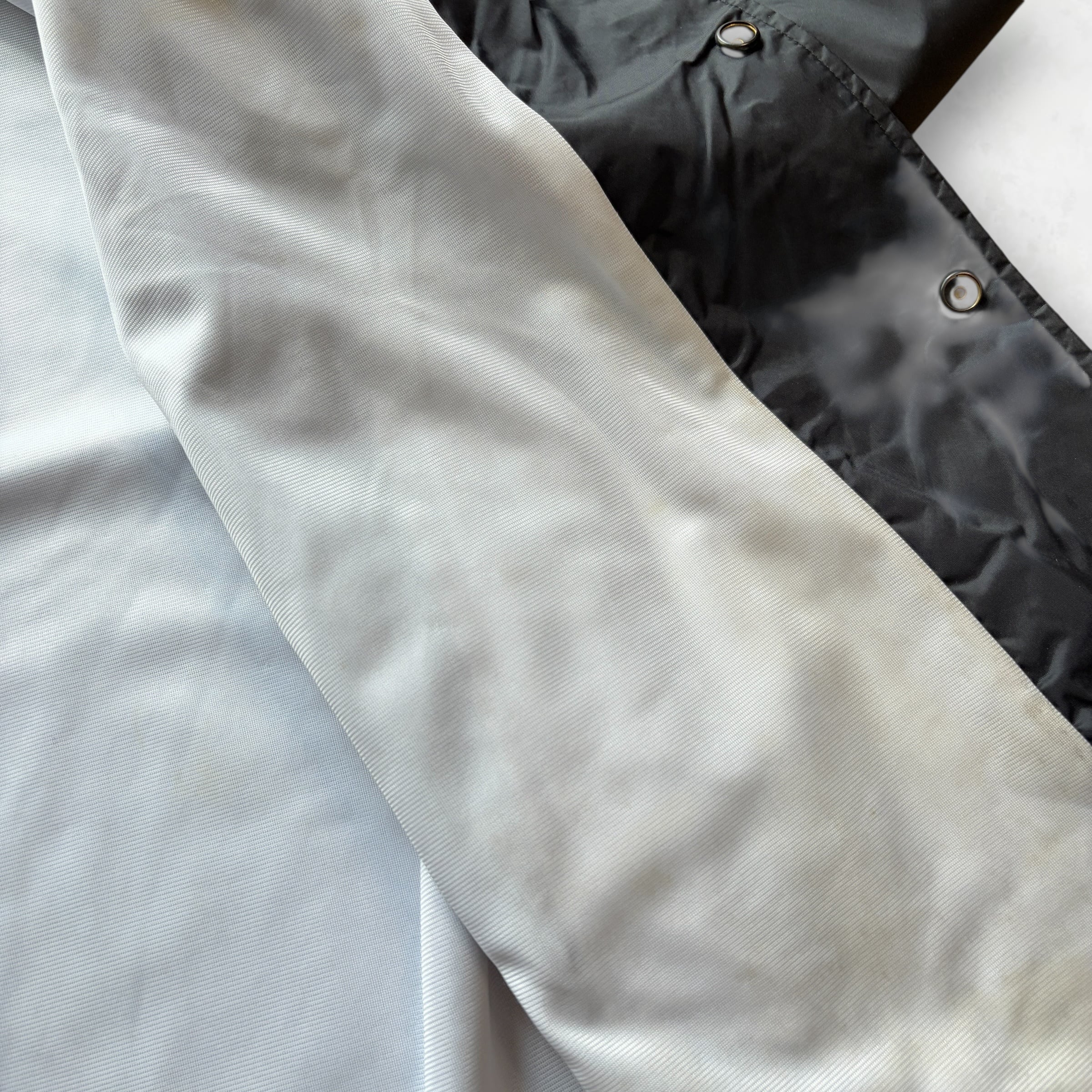 Point: バックを大胆に飾るビッグロゴに加え、フロントの胸元と裾ポケット横に配された変則的なロゴ配置が秀逸。ポリエステルのライニング(裏地)付きで、風を通さず通年で活躍します。ラグランスリーブ特有の「肩がストンと落ちる」シルエットは、ストリートにおいて欠かせない要素です。