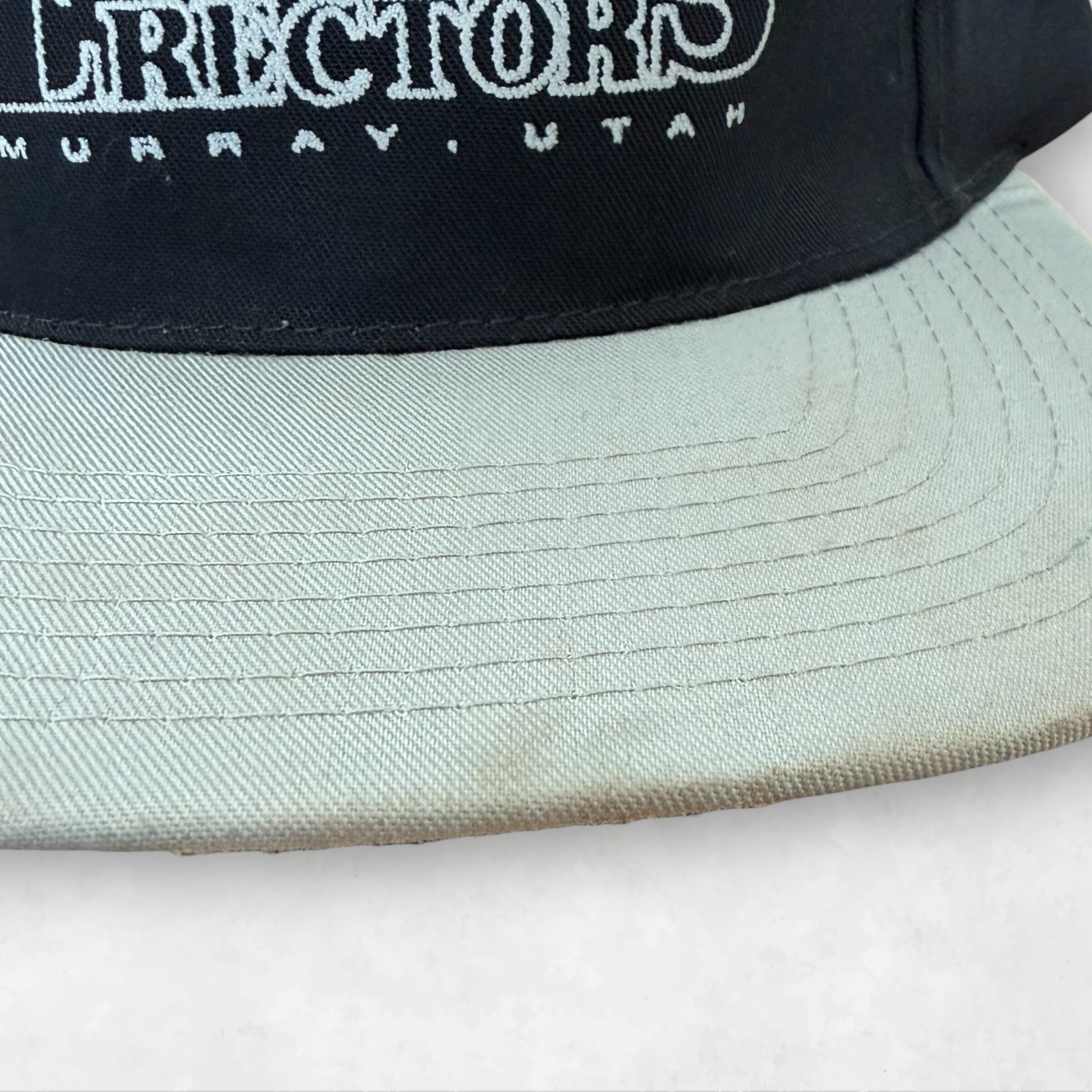 90年代の企業物スナップバックキャップ。ブラックのクラウンにグレーのバイザー、そしてフロントには鉄骨を担ぐタフなキャラクターの刺繍。飾りっ気のない、本物のワークウェアだけが持つ「重み」を感じさせる一着です。企業物って探すのが大変だけど、だからこそ出会った時の特別感があるんですよね。