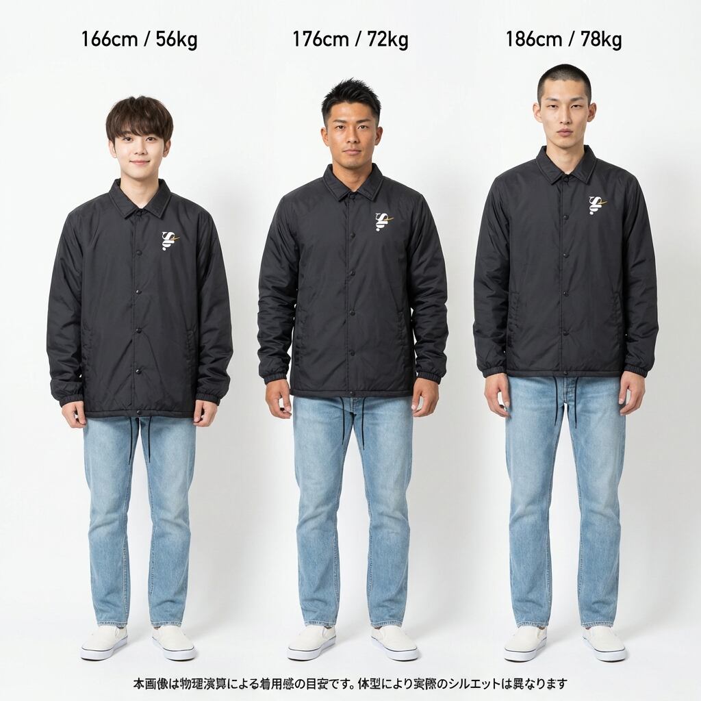 Fitting: 175cm 〜 180cm前後(ジャストで着こなす都会的スタイル) / 165cm 〜 170cm(袖の溜まりを活かしたルーズな着こなし)