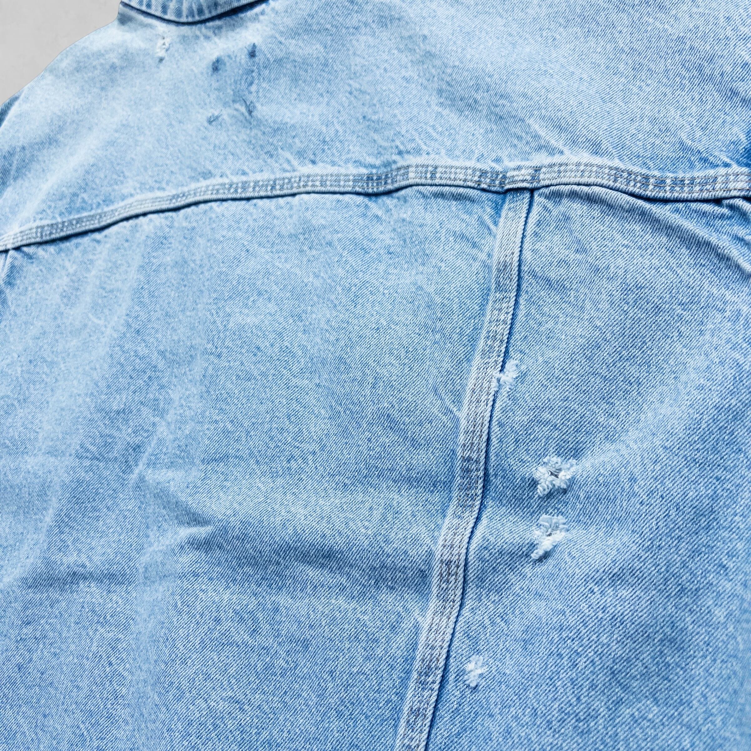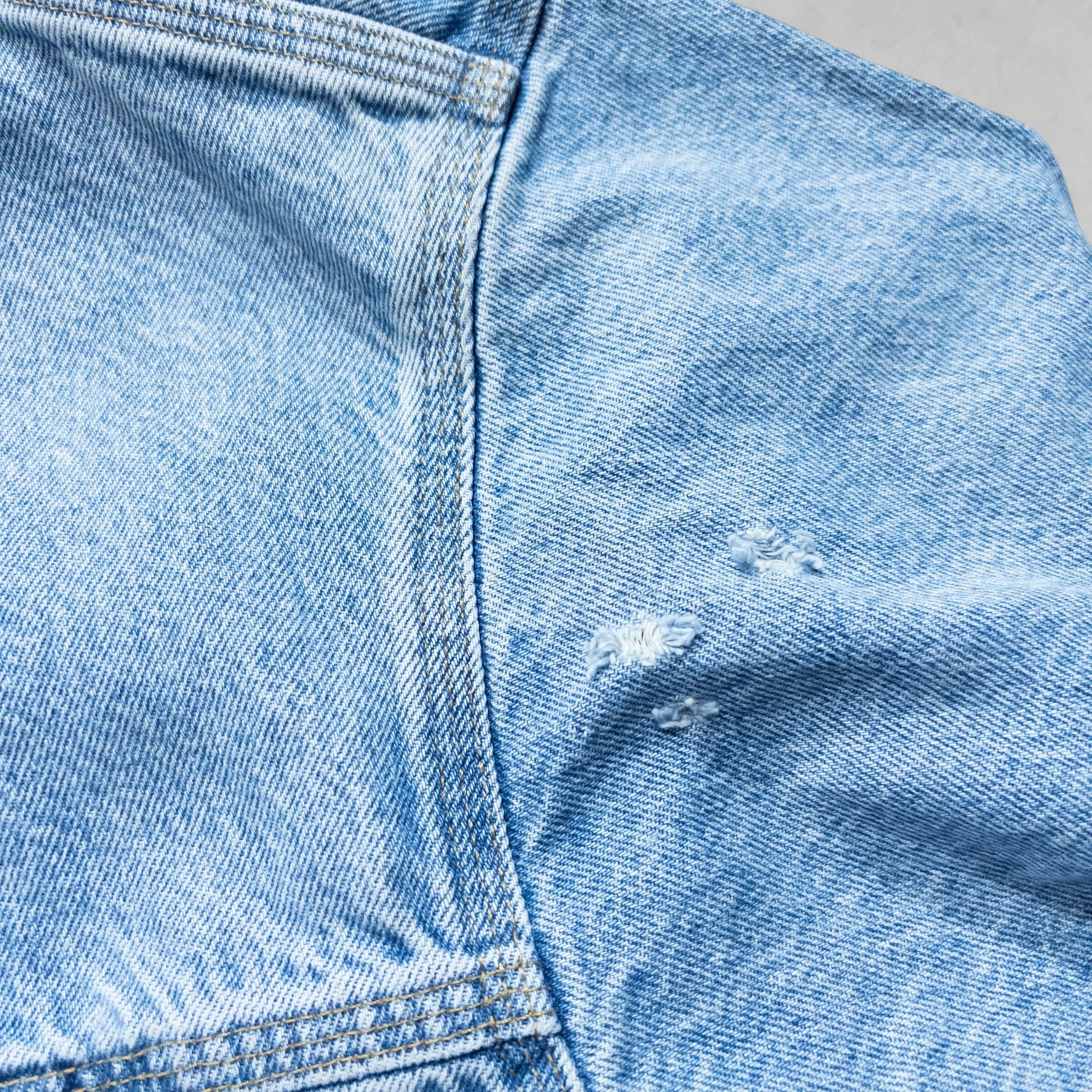 Carharttのアーカイブの中でも、群を抜いて巨大なサイズ感を持つ一着。アイスブルーにまでフェードしたデニム地は、春の陽光を柔らかく反射し、前後あちこちに散りばめられたダメージが、長い年月を経て完成された「機能美」を物語ります。ただ大きいだけではない、圧倒的な「個」を感じさせるマスターピースです。