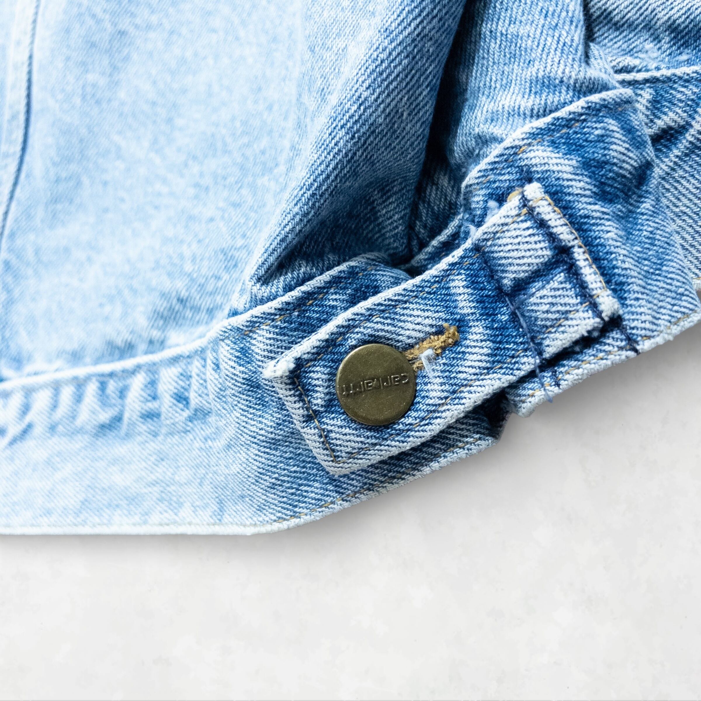Point: 存在感のあるCarharttロゴパッチと、デニムジャケットの概念を覆す超ワイドなシルエット。前後の絶妙な位置に配された「いい感じの穴」が、インナーとのレイヤードに無限の可能性をもたらします。肉厚なデニムながら、長年の着用により驚くほどしなやかに馴染んだ質感も魅力。