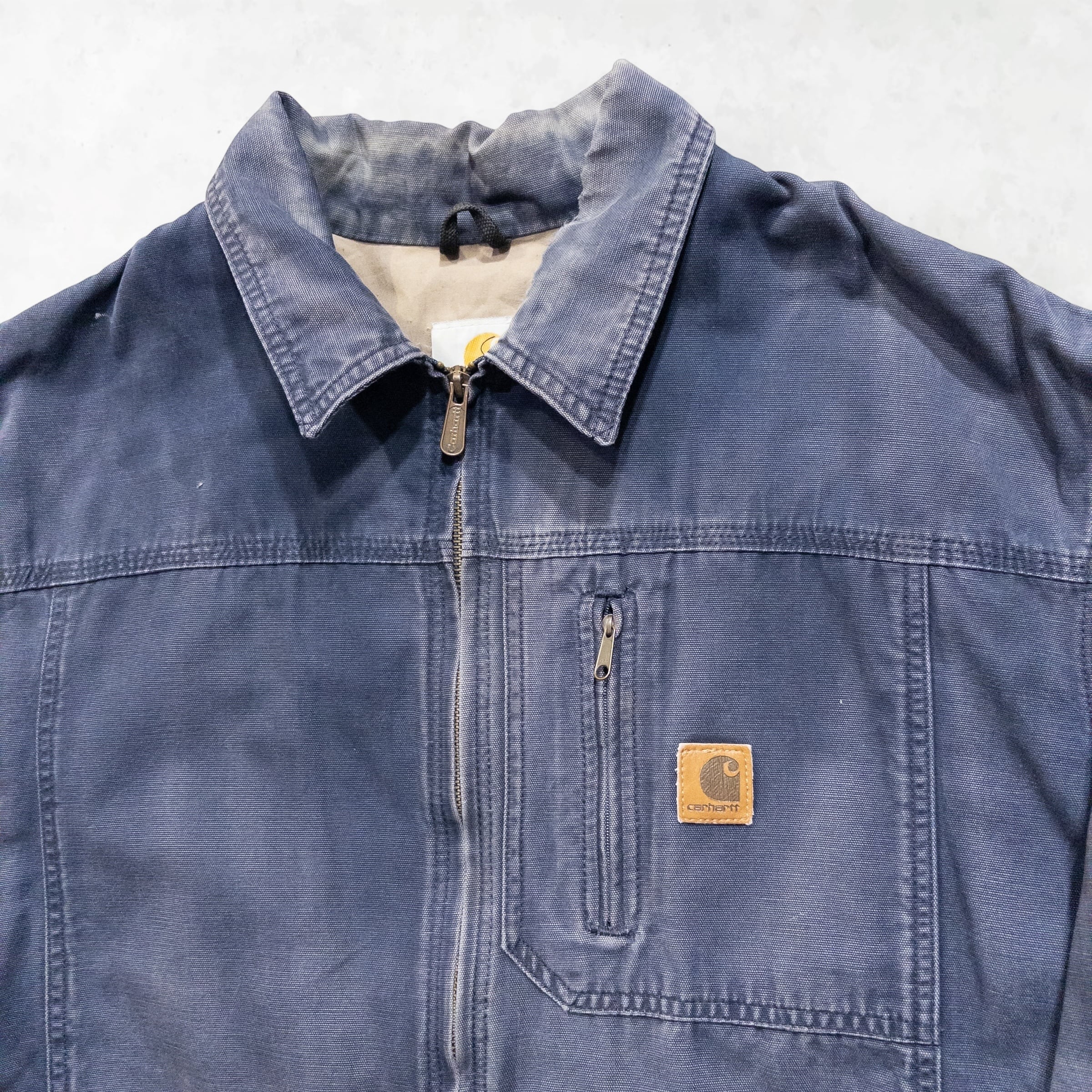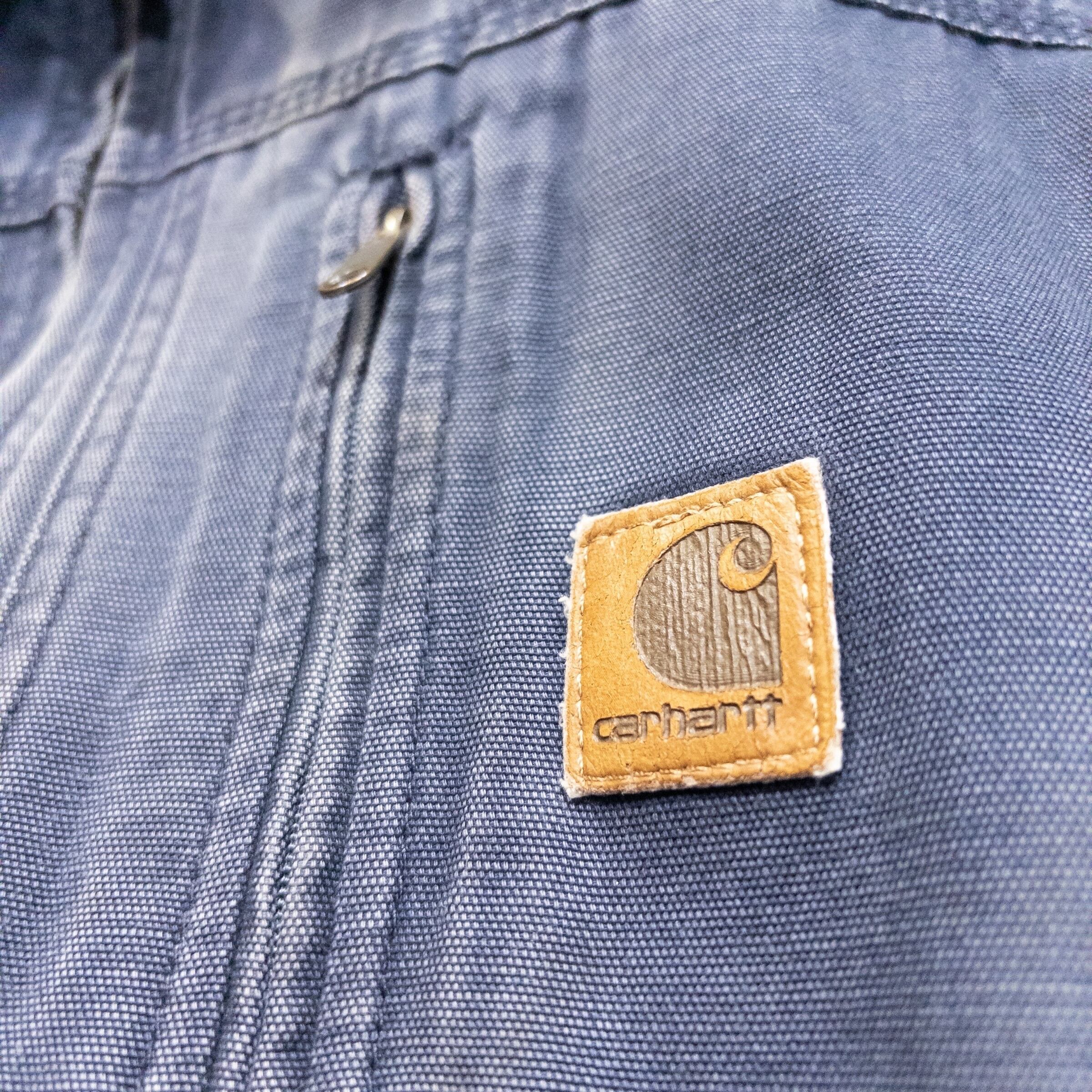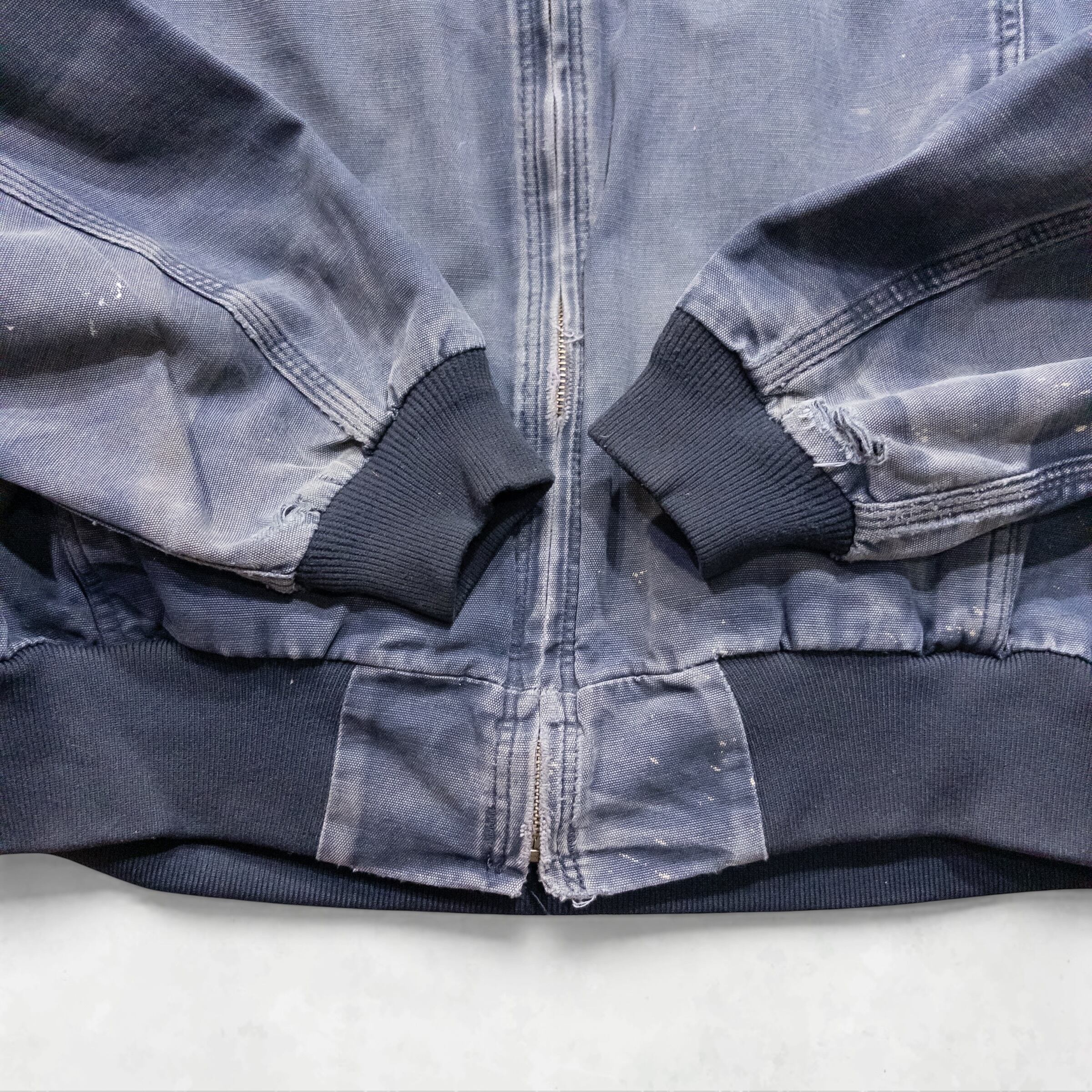 Memo: 全体的にCarhartt特有の美しいフェード(色褪せ)が見られます。特に袖口(画像参照)にはリアルな摩耗と解れがありますが、これが「ボロ」としての凄みを引き立てる最高のアクセントになっています。ジップ等の機能面は良好で、タフに使い込める現役のコンディションです。