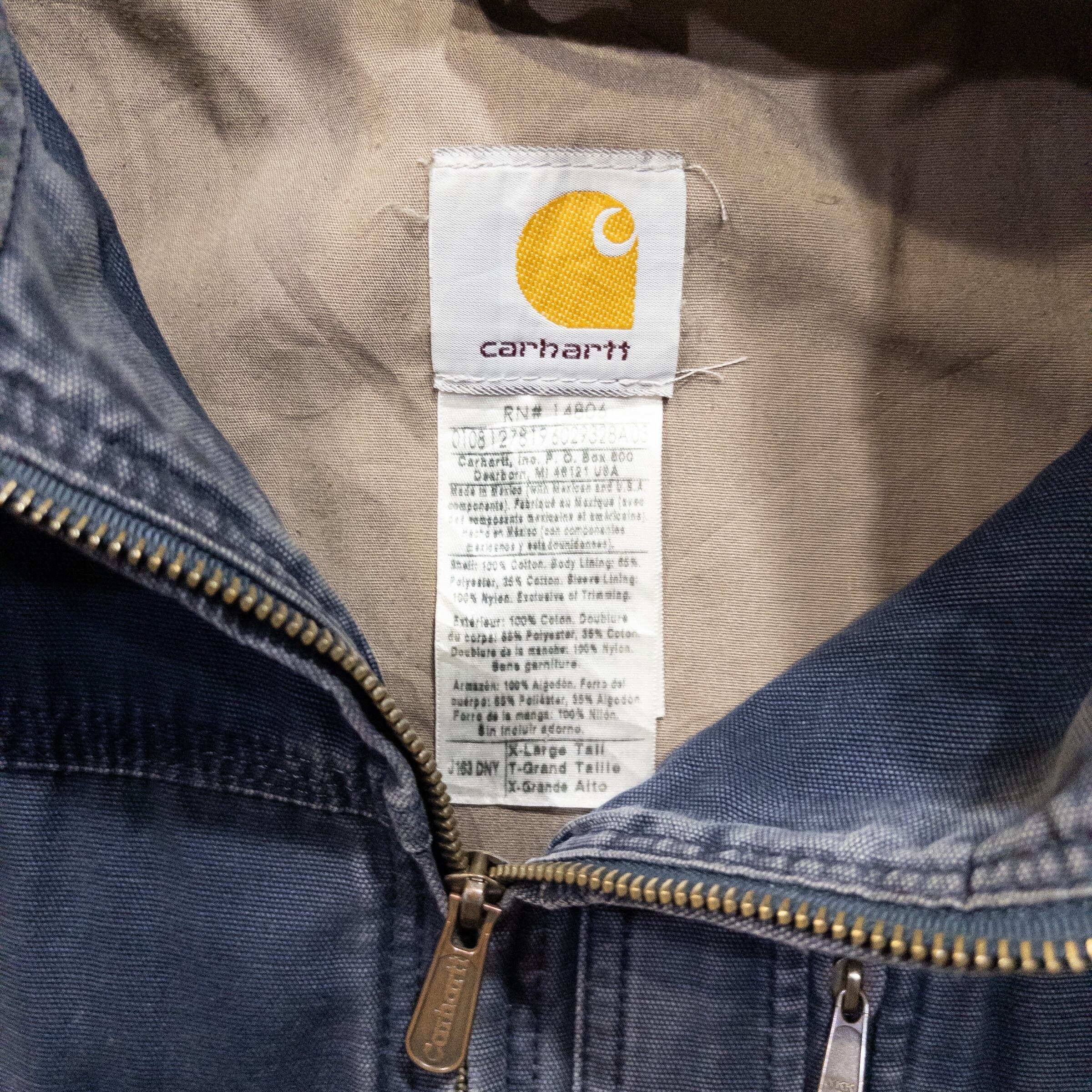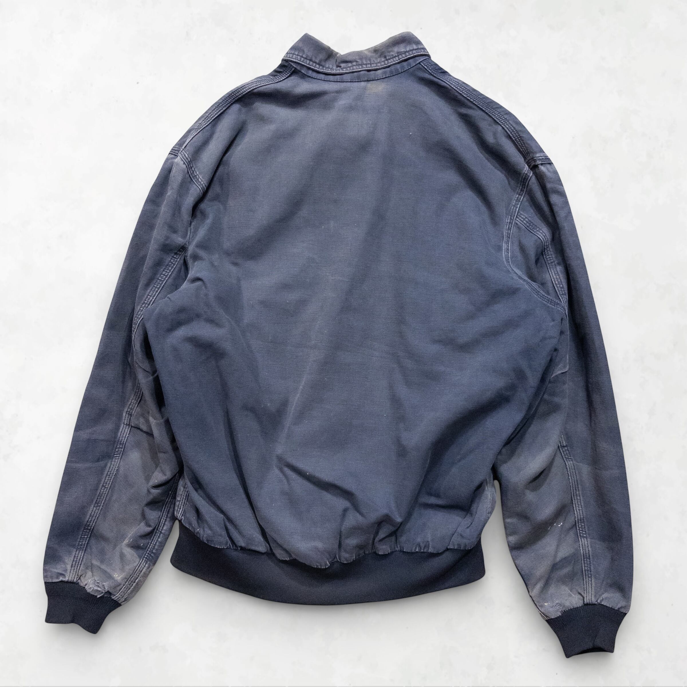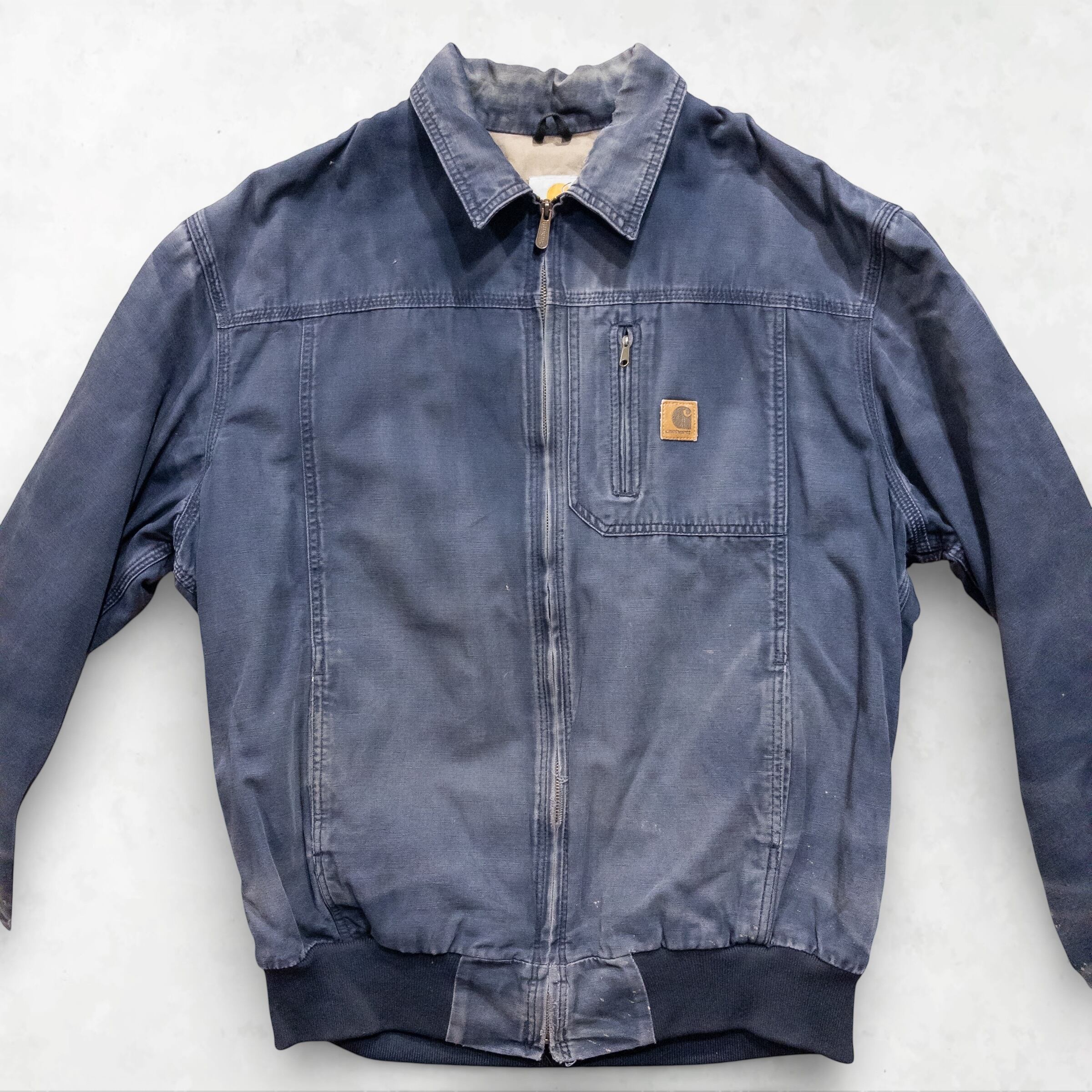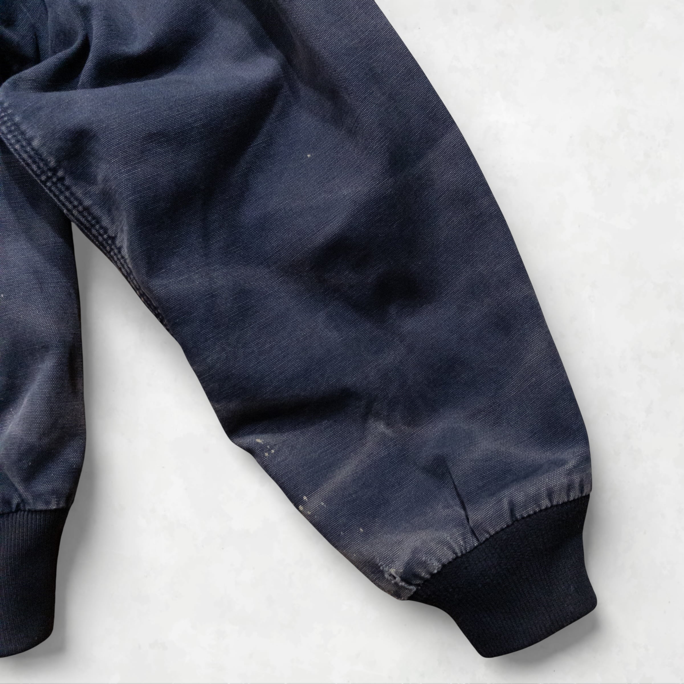 Memo: 全体的にCarhartt特有の美しいフェード(色褪せ)が見られます。特に袖口(画像参照)にはリアルな摩耗と解れがありますが、これが「ボロ」としての凄みを引き立てる最高のアクセントになっています。ジップ等の機能面は良好で、タフに使い込める現役のコンディションです。