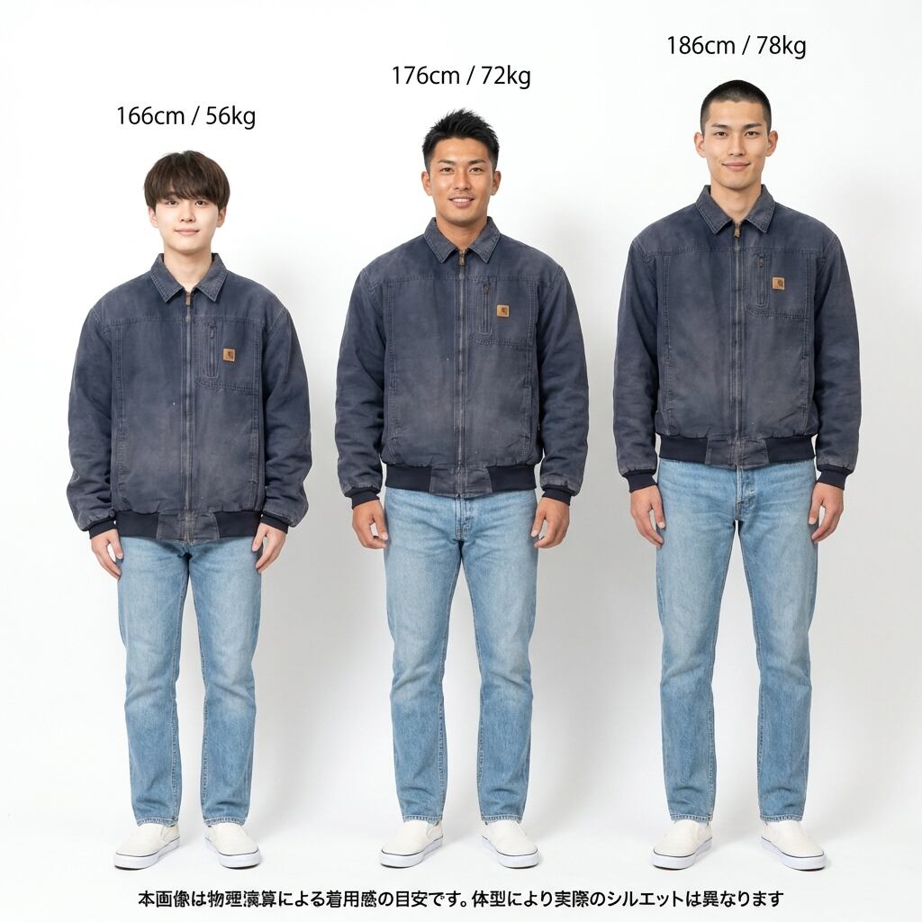 Fitting: 180cm以上(ゆとりのある本来のワークスタイル) / 170cm 〜 175cm(袖の溜まりと着丈を活かしたロングラインなストリートスタイル)