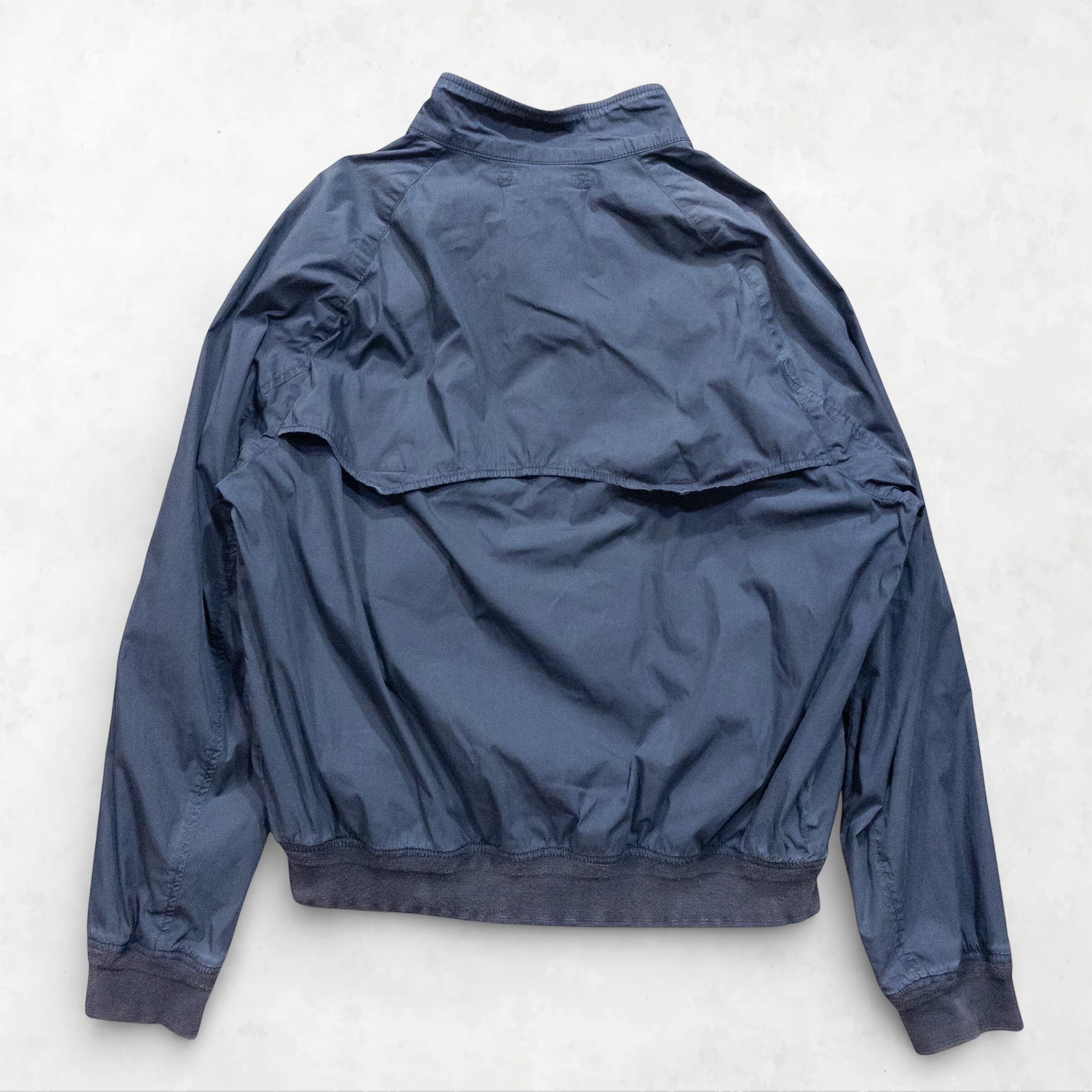 Polo Ralph Laurenの真骨頂とも言える、アンブレラヨークを搭載したドリズラージャケット。90年代特有のたっぷりとしたXLのサイズ感が、現代のストリートシーンに絶妙なリラックス感を与えます。使い込まれたネイビーのフェード感は、もはや「仕様」としての完成度。雨を逃がすための機能美が、そのままデザインのアイデンティティとなった一着です。