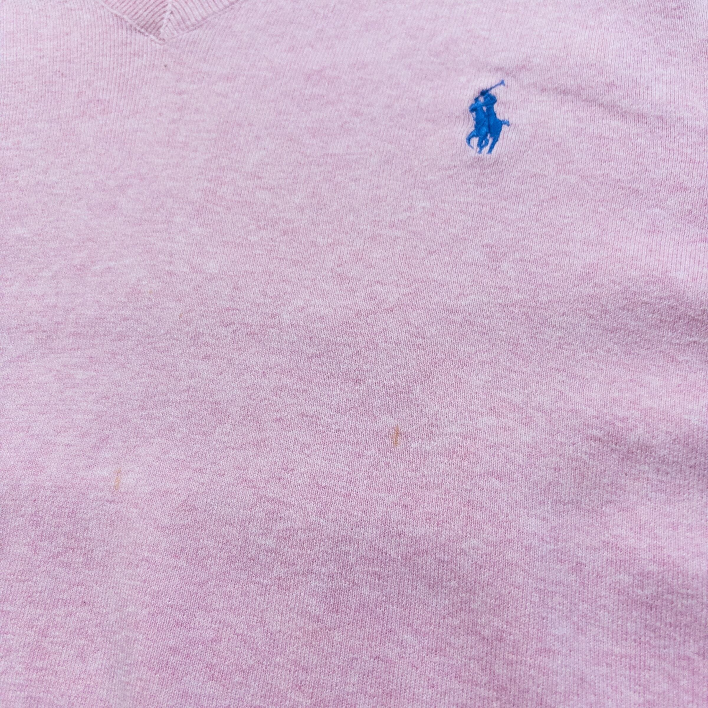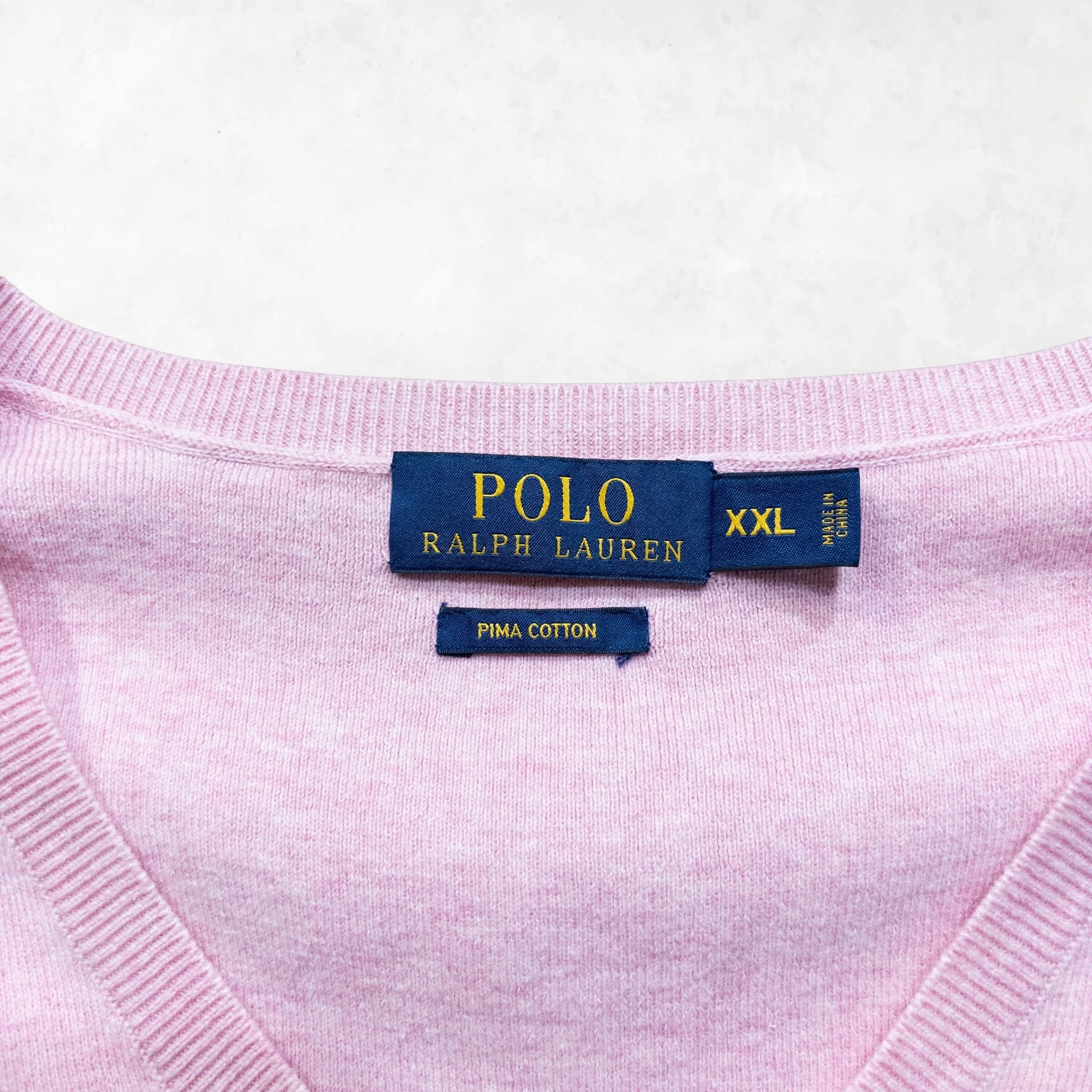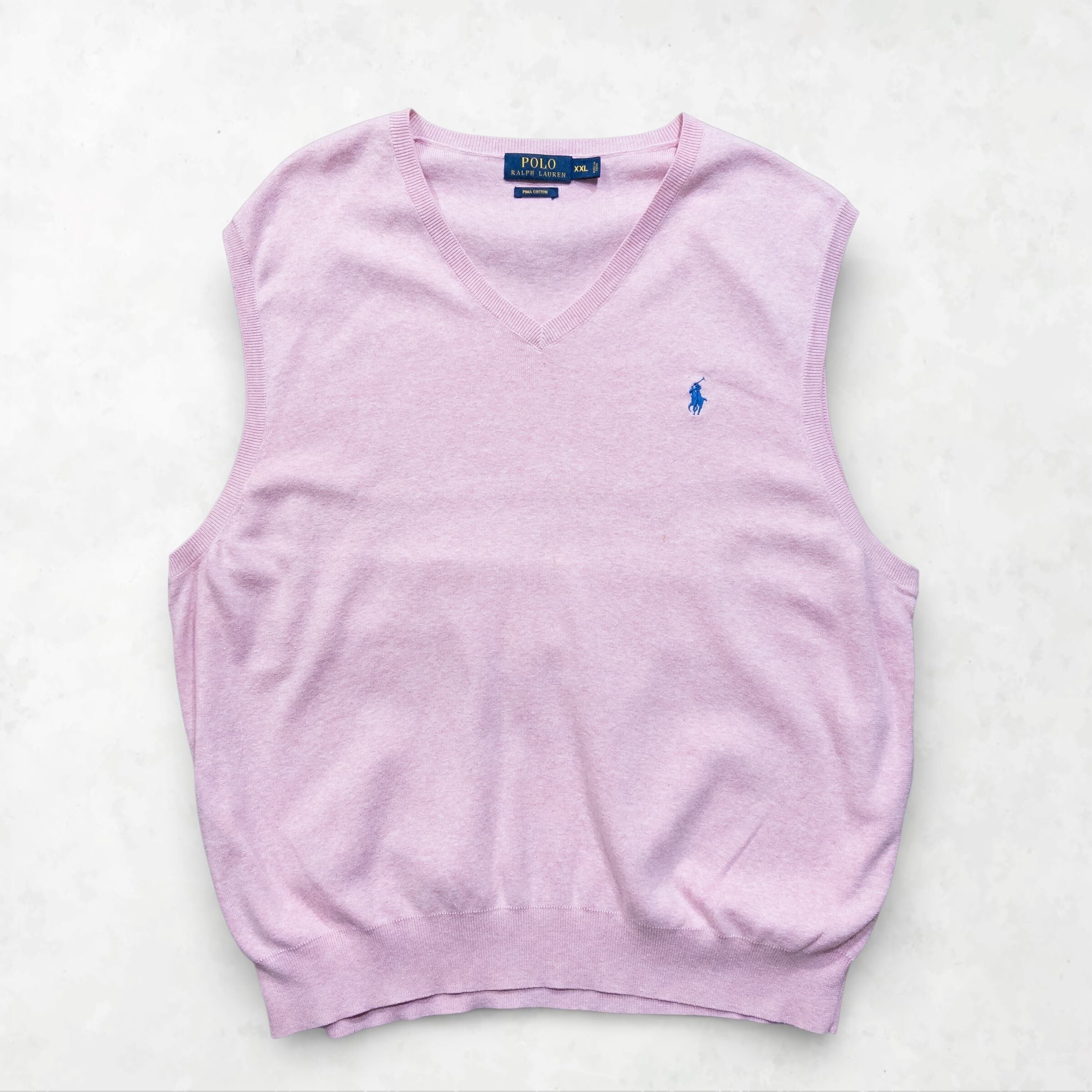 ラルフローレンの春の定番、ピーマコットンシリーズから、一際目を引くベビーピンクの個体が登場です。上品なイメージの強いニットベストを、あえてXXLという特大サイズで。この「色」と「サイズ感」のギャップこそが、今のストリートに最も必要なエッセンスです。