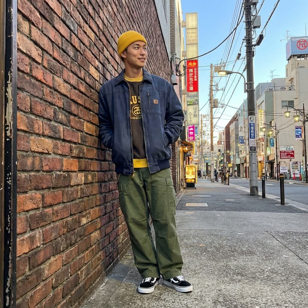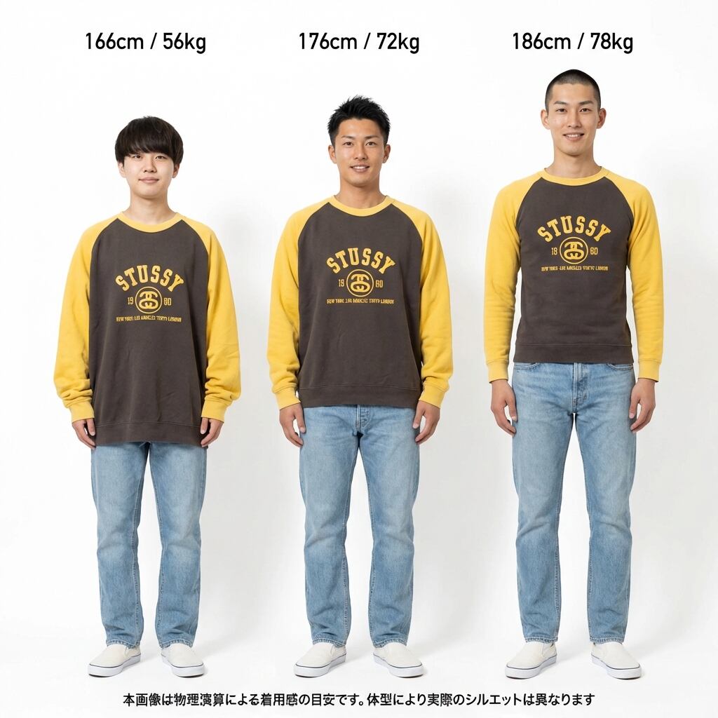 Fitting: 170cm 〜 175cm前後(ゆったりとしたストリートスタイル) / 160cm 〜 165cm(オーバーサイズを活かしたリラックススタイル)