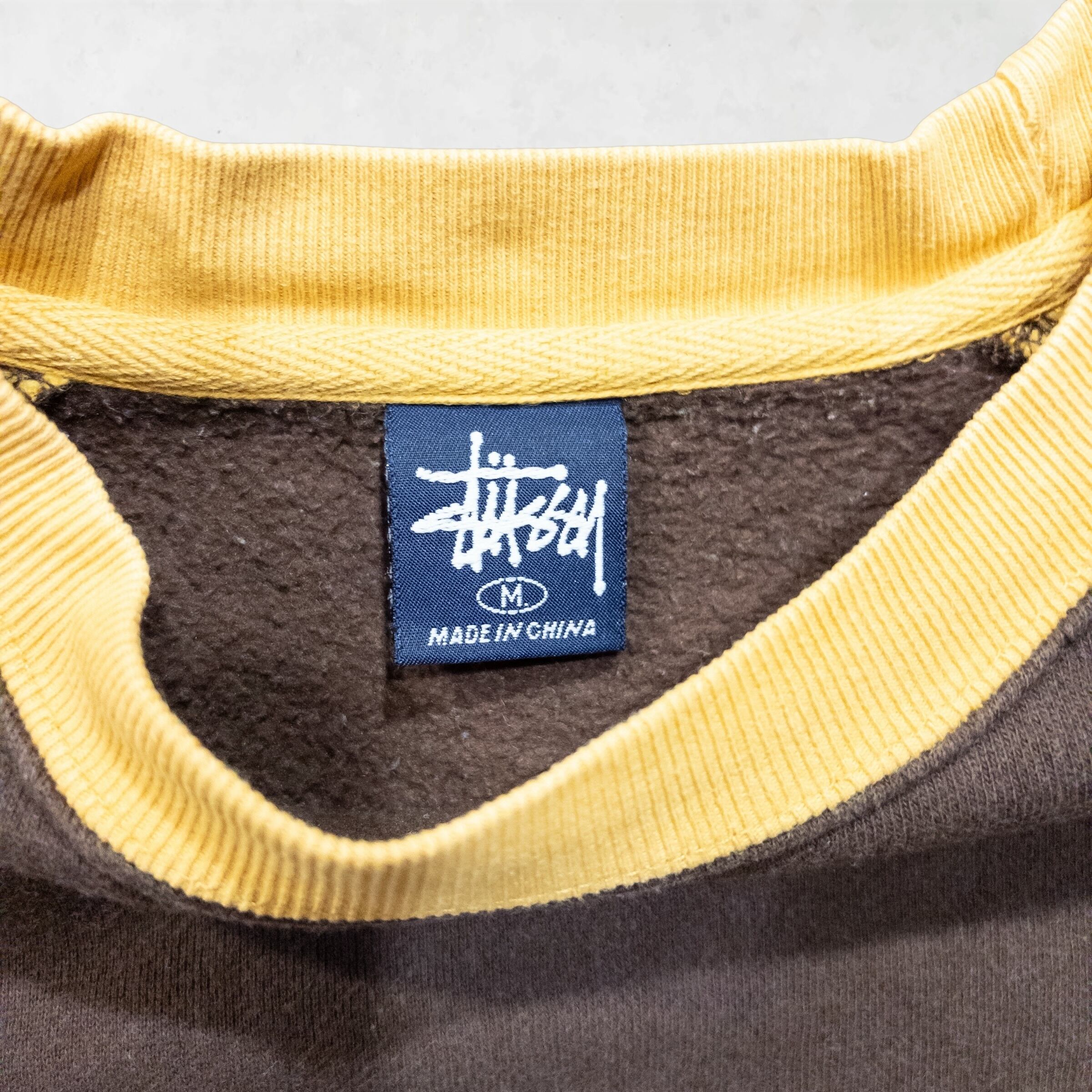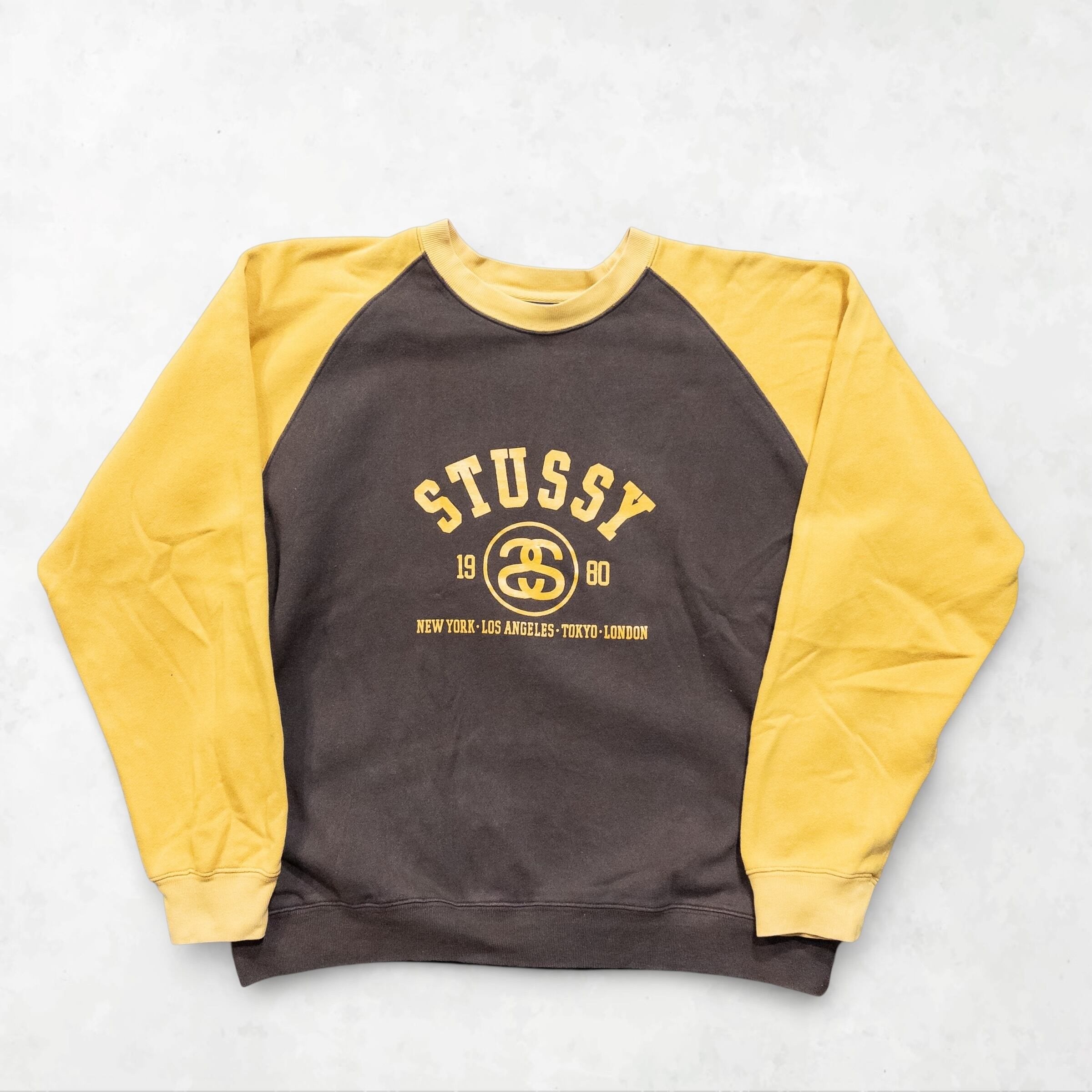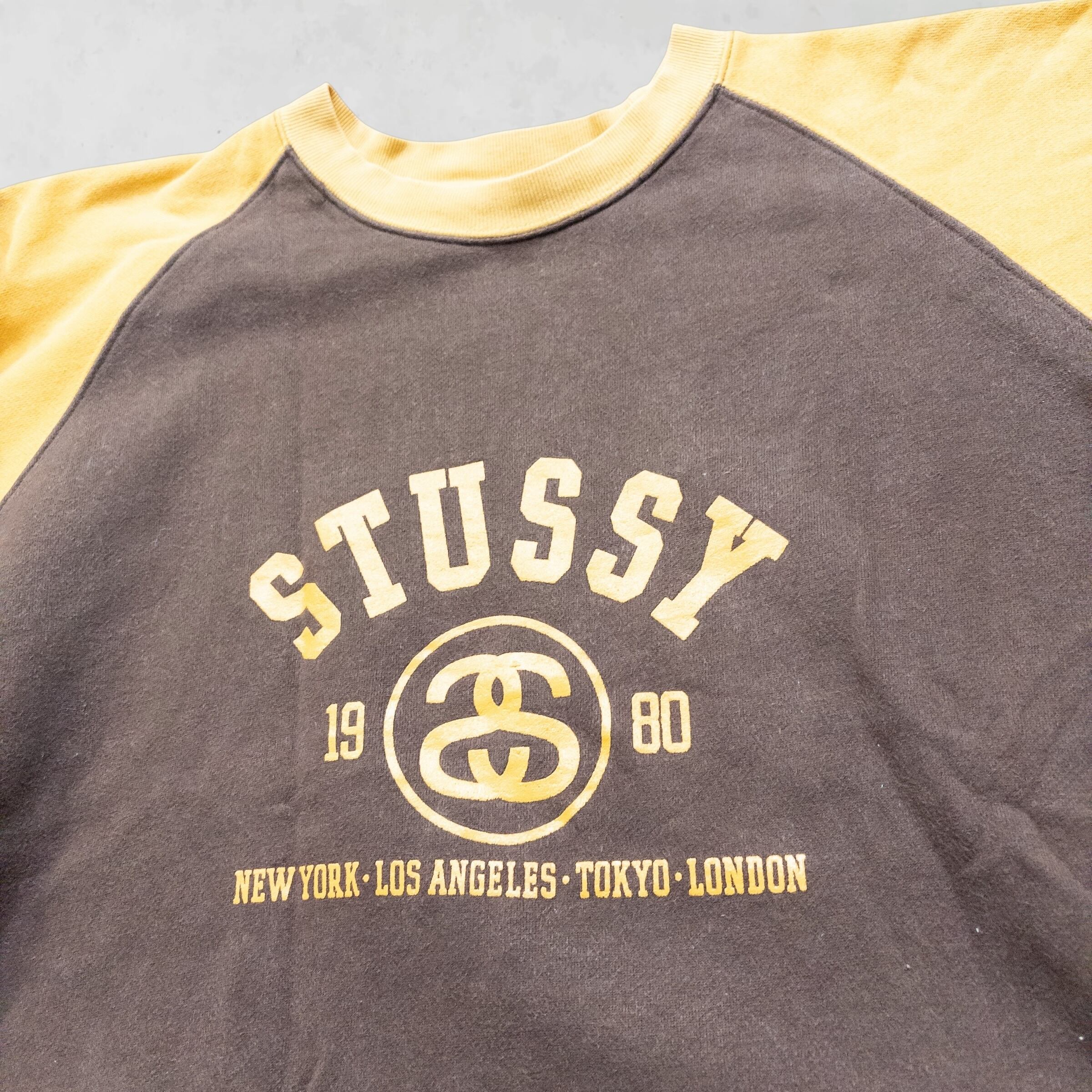 90年代のStussyを象徴する、ブラウン×イエローの力強いコントラストが目を引くラグランスウェットです。胸元に刻まれた「World Tour」の地名とアイコニックなダブルSロゴ。シンプルながらも圧倒的な存在感を放つこの一枚は、袖を通すだけで当時の空気感へとタイムスリップさせてくれる、まさに「正解」の一着です。