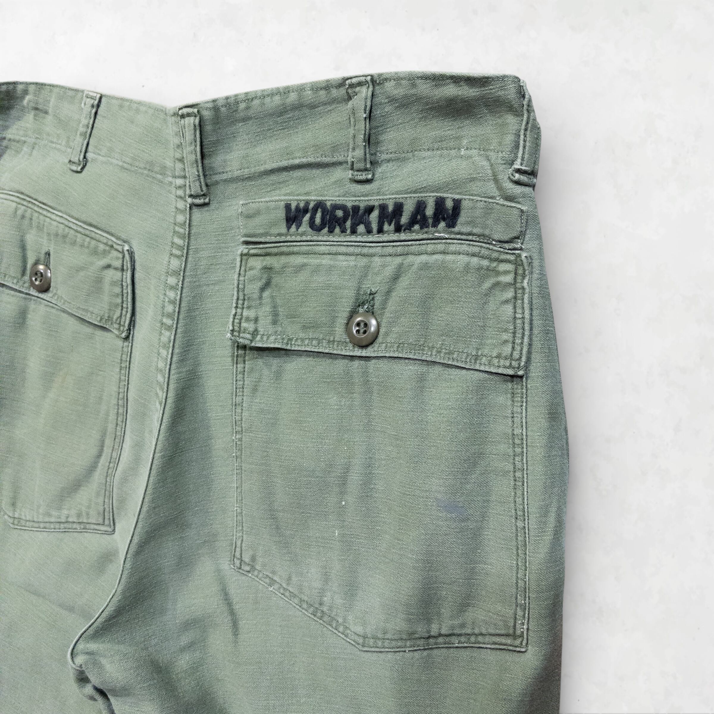 ヴィンテージミリタリーの王道であり、永遠の定番である通称「ベイカーパンツ」。今回の一着は、背面に施された「WORKMAN」の直刺繍と、フロントに散るリアルなペンキ飛びが、レプリカには絶対に出せない圧倒的なリアリティを放ちます。クリーンなアイテムと合わせて、その「無骨さ」を際立たせてほしい、魂のアーカイブです。