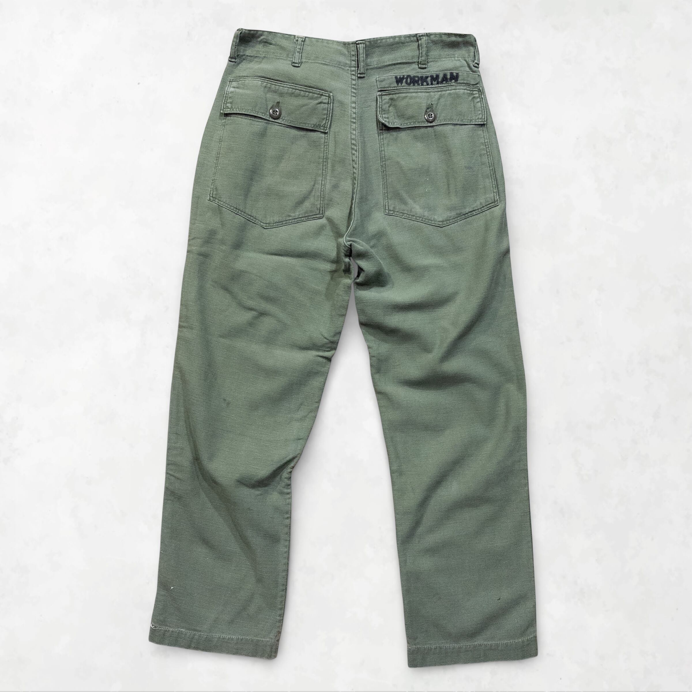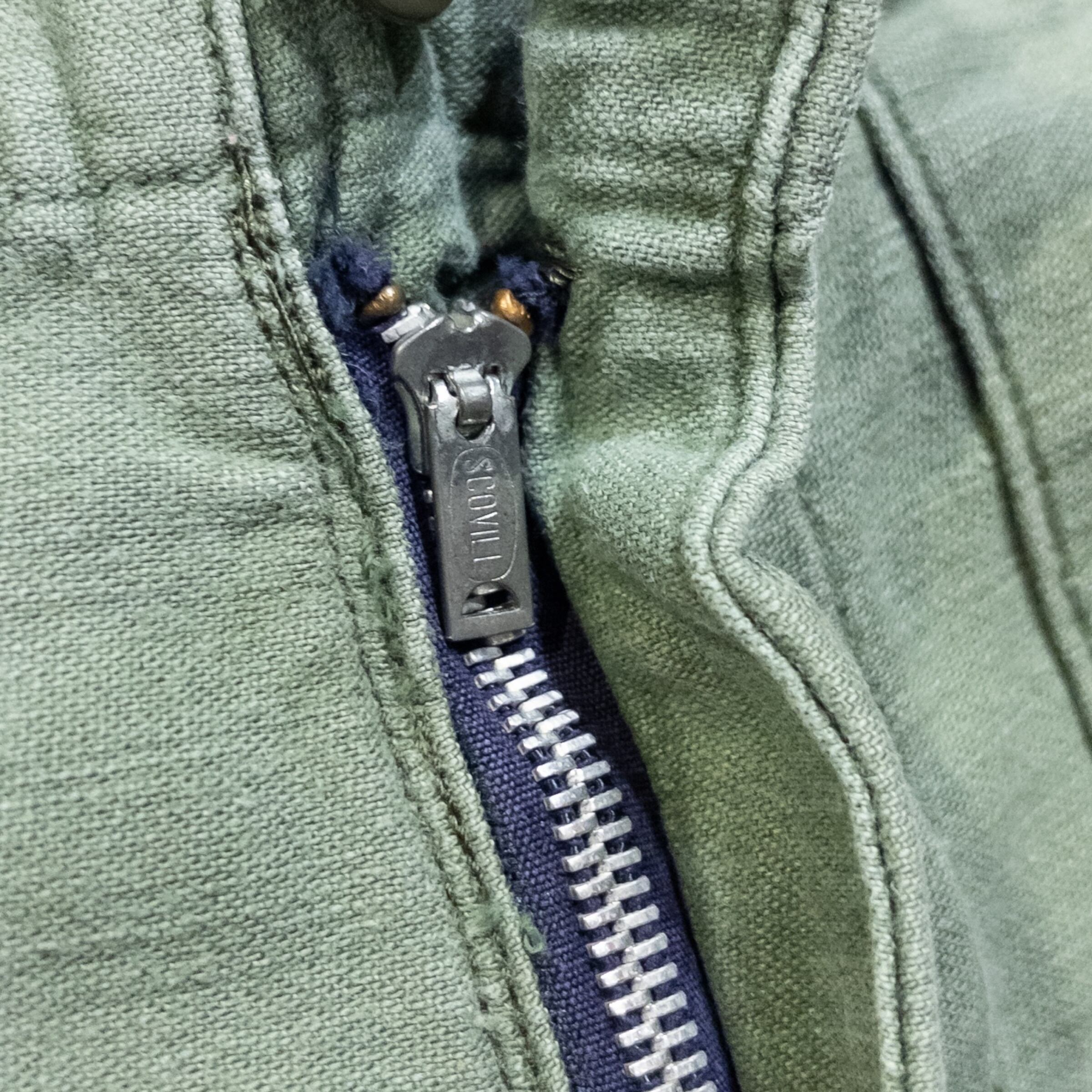Point: 米軍の傑作素材「OG-107」コットンサテンを使用。背面ポケット上には、当時の持ち主によるものと思われる「WORKMAN」の刺繍が施されており、一点物としての価値をさらに高めています。さらに特筆すべきは、ジッパーが同年代の「Scovill」製へと丁寧に交換されている点。ヴィンテージの風合いを損なわず、実用性を追求した「生きたアーカイブ」を感じさせるディテールです。