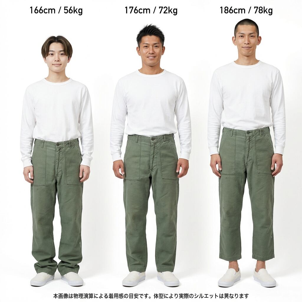 Fitting: 170cm 〜 175cm前後(ジャストで綺麗に履きこなせるサイズ感) / 165cm前後(少し腰を落として、ルーズな雰囲気で楽しむスタイル)