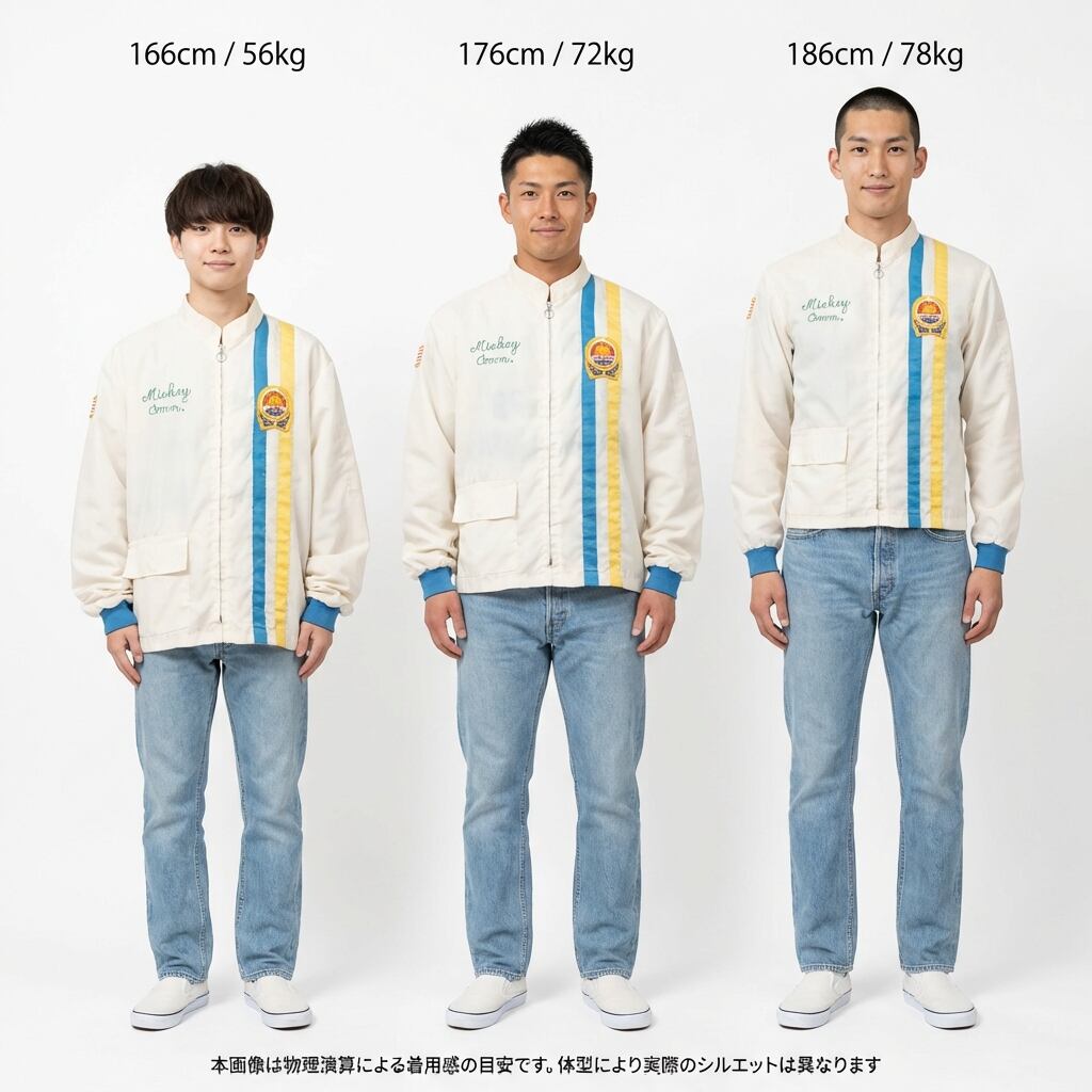 「肩幅51cm、身幅60cmという、ヴィンテージのLサイズらしい完成されたボックスシルエット。裾に絞りがないため、インナーの裾を覗かせるレイヤードが非常に綺麗に決まります。春先、カットソーの上からサラッと羽織るだけでスタイルが完成する、魔法のようなサイジングです。」