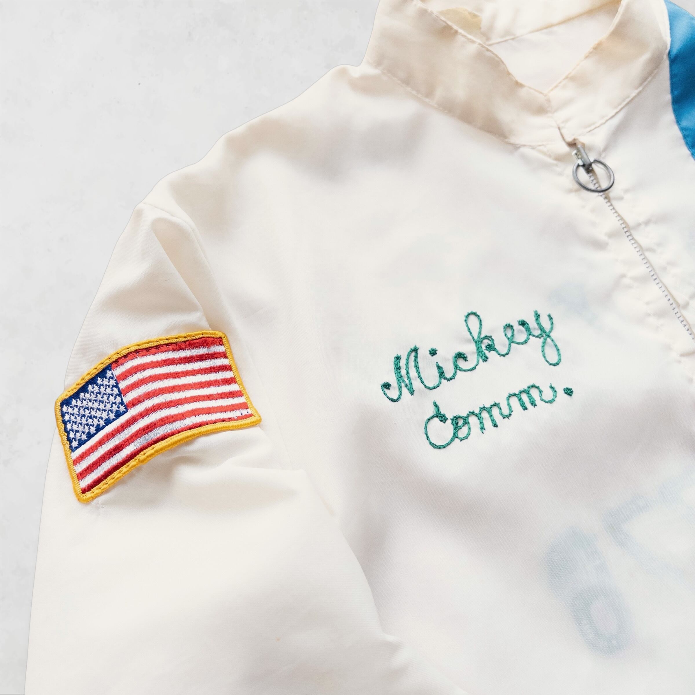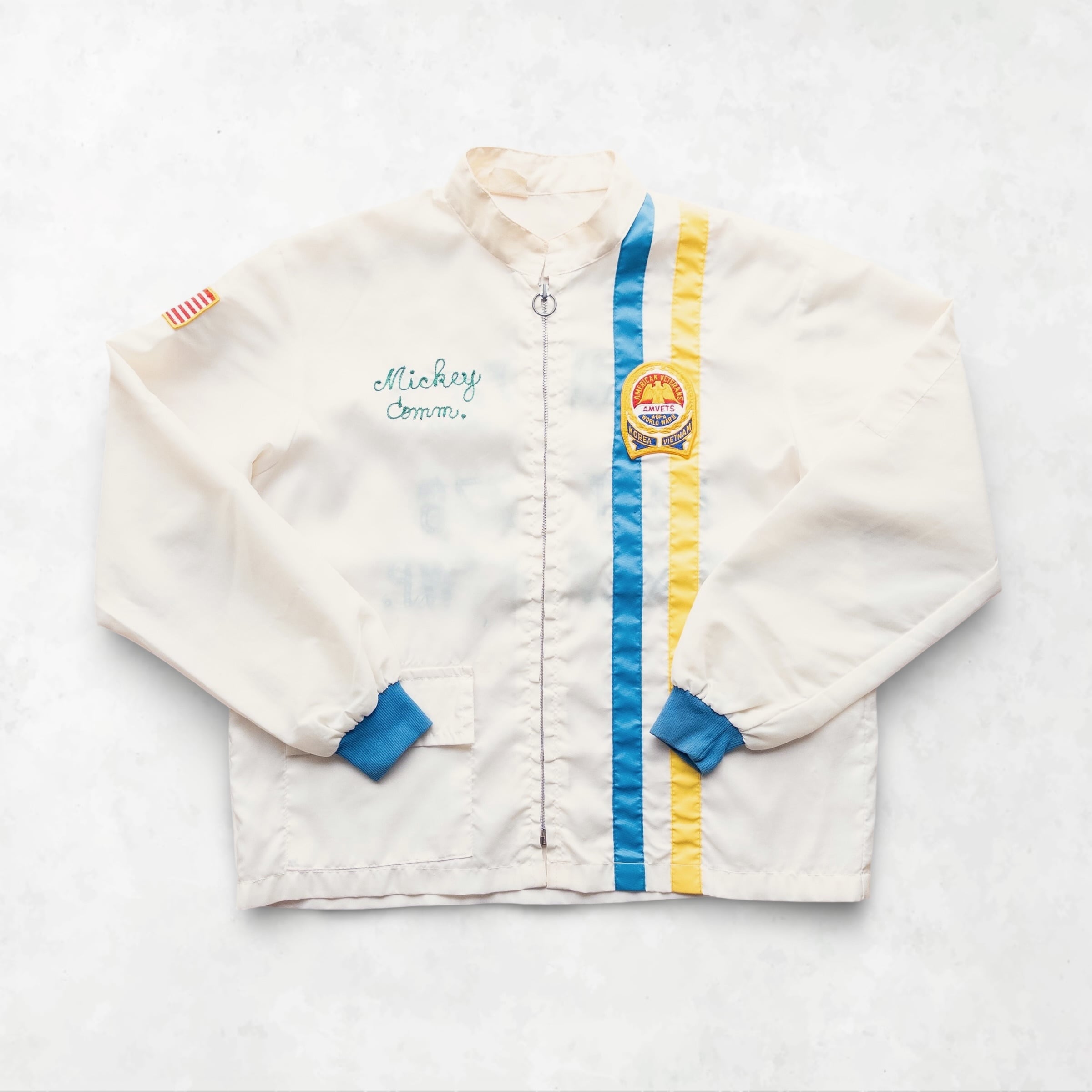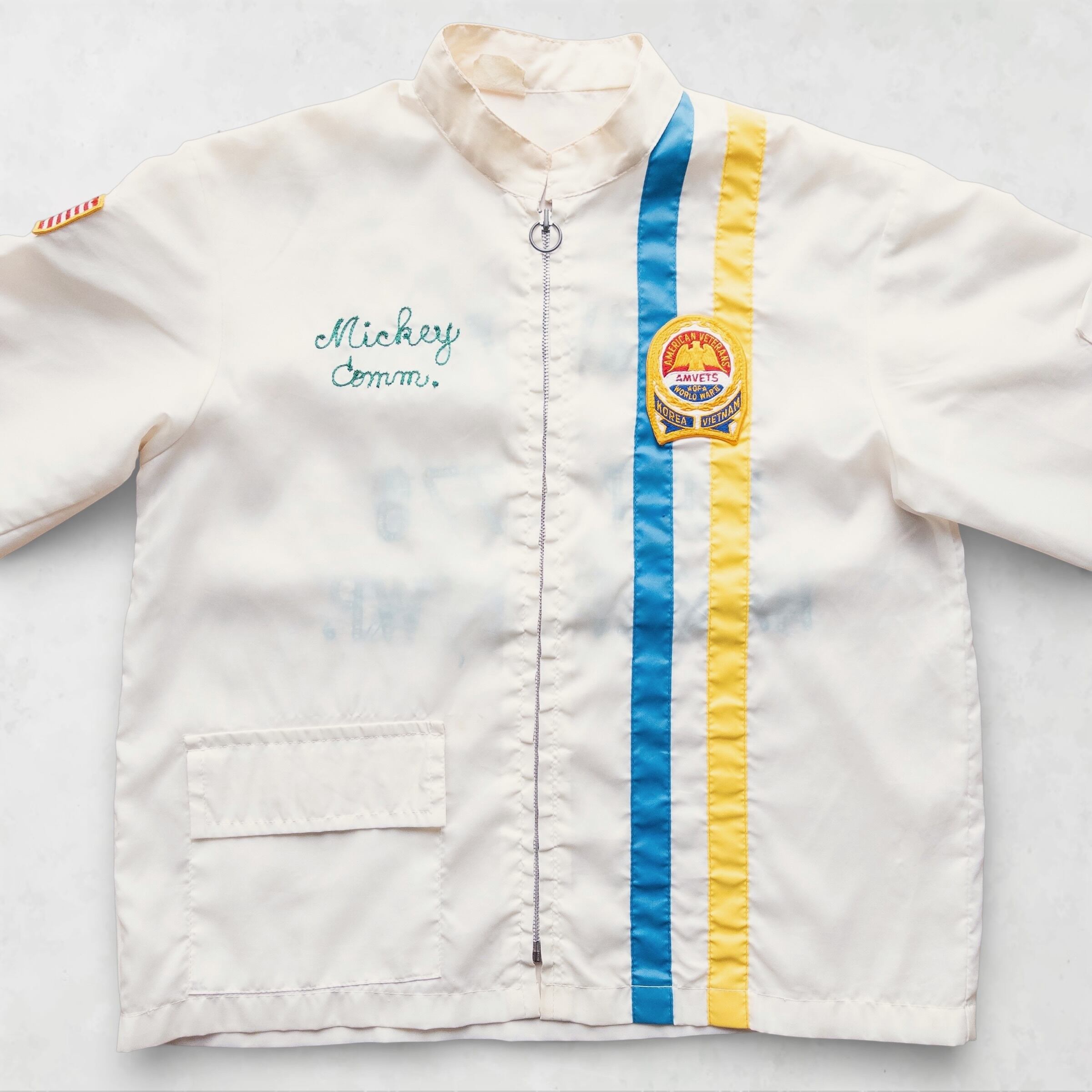 アメリカ退役軍人会(AMVETS)のメンバーが実際に着用していたと思われる、非常に希少なカスタムジャケットです。オフホワイトのボディを縦に走るレーシングストライプ、そして胸元に刻まれた「Mickey」のネーム刺繍。裾のドローコードを排した潔いカットは、現代のレイヤードスタイルにもスッと馴染む、洗練されたワークシルエットを構築します。