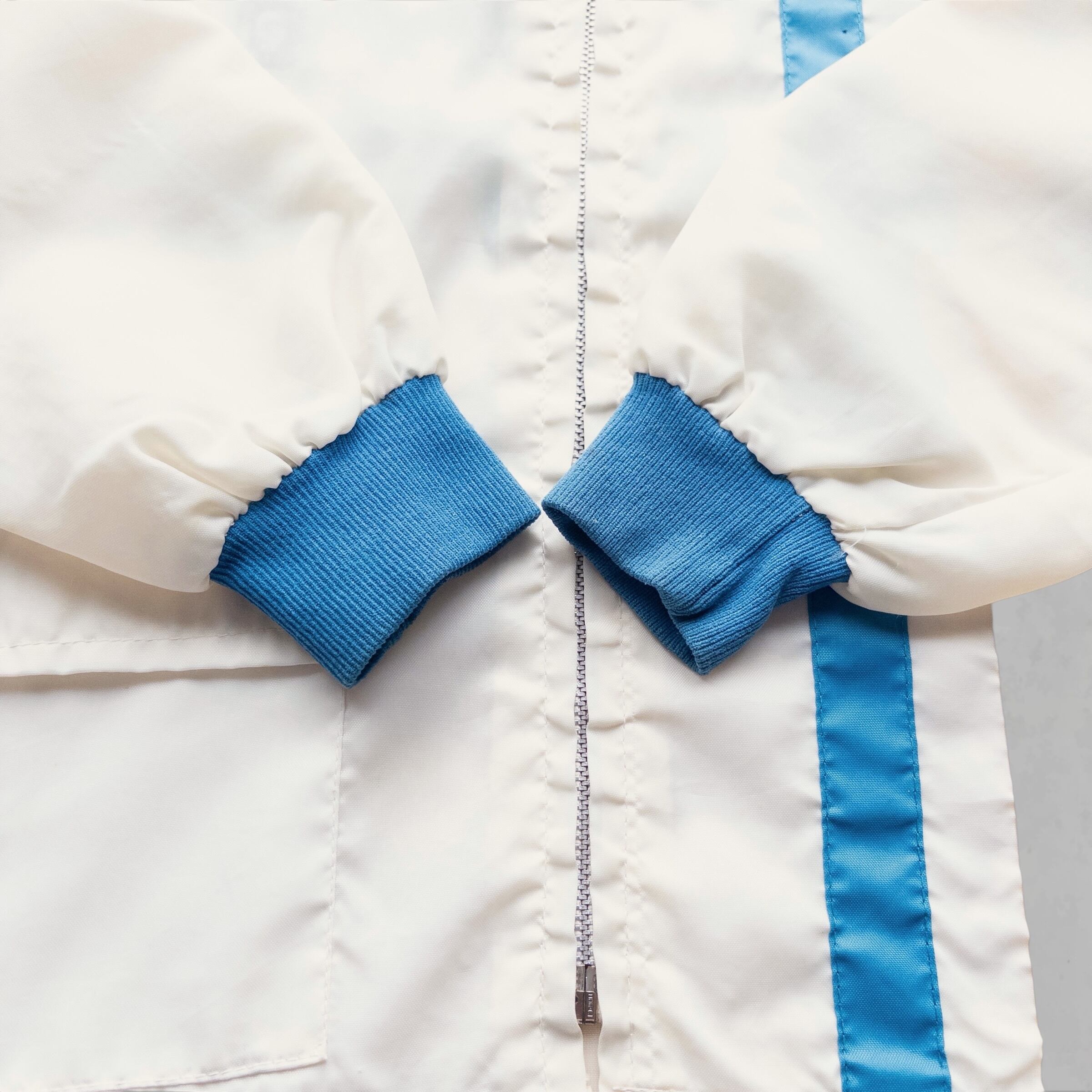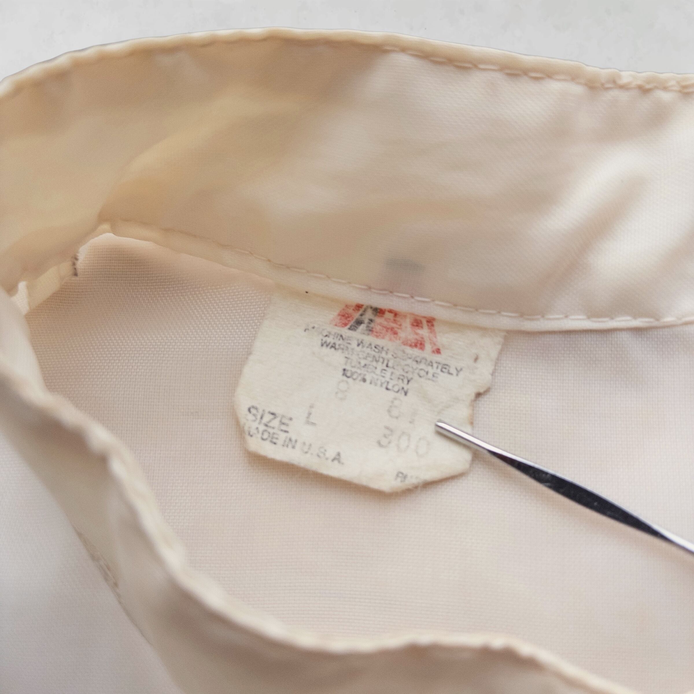 Memo: 50年近く前の白いナイロンアイテムとしては、非常に良好な状態を保っています。襟裏にヴィンテージ特有の薄い黄ばみが見られますが(画像参照)、着用時にはほとんど目立たず、この個体が持つ歴史の深みとして楽しんでいただけます。その他、大きなダメージや汚れはなく、これからも現役で活躍してくれる一着です。